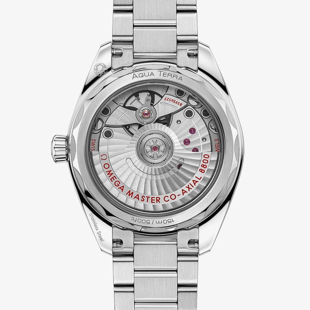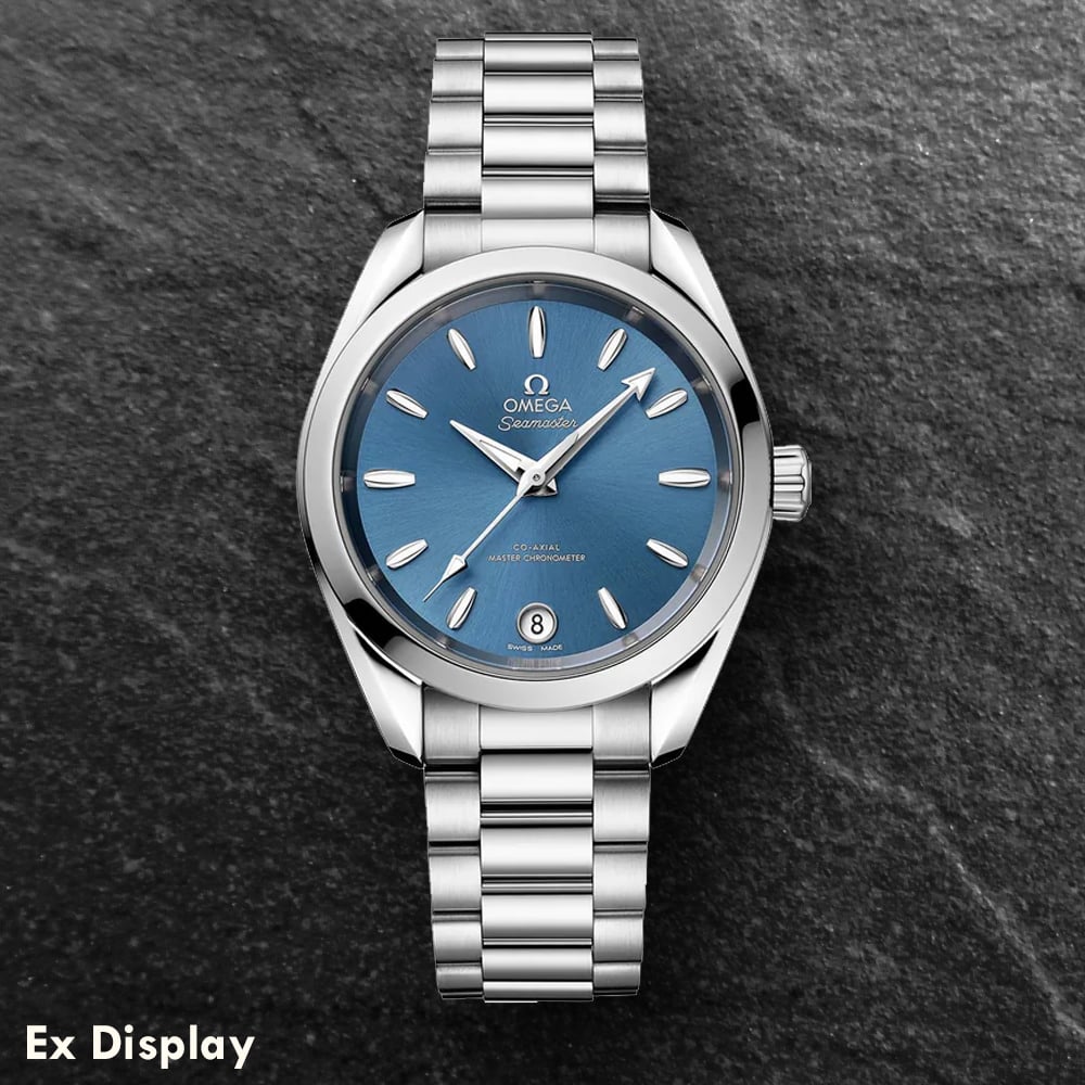 The OMEGA Seamaster Aqua Terra Blue Chronometer Watch 220.10.34.20.03.002 combines a 34mm round-shaped polished stainless steel case and a silver stainless steel bracelet with a fold-over clasp. It has a sea blue sun-brushed analogue dial fashioned from brass with luminescent hands and indexes; the date is visible at position six, protected beneath domed scratch-resistant sapphire crystal glass with anti-reflective treatment on both sides. Power is generated by the self-winding automatic movement with Co-axial escapements, with an approximate power reserve of 55 hours. Certified Master Chronometer, approved by METAS, resistant to magnetic fields reaching 15,000 gausses. This model also has a water resistance of up to 150 metres.