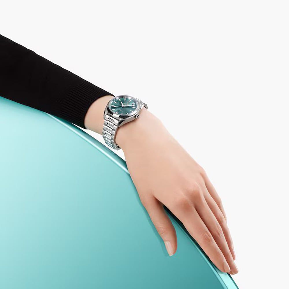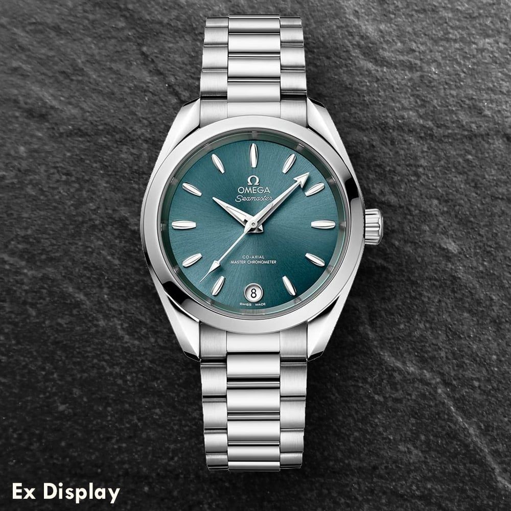 The OMEGA Seamaster Aqua Terra Green Chronometer Watch 220.10.34.20.10.001 combines a 34mm round-shaped polished stainless steel case and a silver stainless steel bracelet with a fold-over clasp. It has a lagoon green sun-brushed analogue dial fashioned from brass with luminescent hands and indexes; the date is visible at position six, protected beneath domed scratch-resistant sapphire crystal glass with anti-reflective treatment on both sides. Power is generated by the self-winding automatic movement with Co-axial escapements, with an approximate power reserve of 55 hours. Certified Master Chronometer, approved by METAS, resistant to magnetic fields reaching 15,000 gausses. This model also has a water resistance of up to 150 metres.