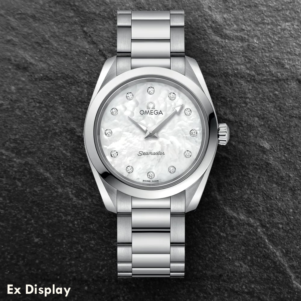 The OMEGA 220.10.28.60.51.001 Seamaster Aqua Terra watch combines a 28mm round shaped stainless steel case and bracelet with a push button clasp. It has a shimmery Mother Of Pearl dial with rhodium plated Super-LumiNova filled hands and 4 diamond hours markers which is protected beneath domed scratch resistant sapphire crystal glass with an anti-reflective treatment on both sides. Power is generated by the Calibre OMEGA 4061 quartz movement. This model also has a water resistance of up to 150 metres.