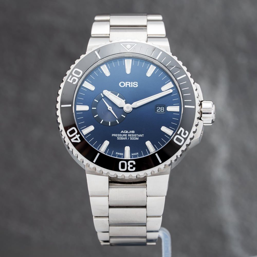 The Oris Aquis Small Second Date combines professional dive performance with refined design. It features a blue dial with small seconds sub-dial, a 45.50mm stainless steel case, and a black bezel with a ceramic insert top ring. Powered by an automatic movement with a date window and finished on a stainless steel bracelet, this robust timepiece is built for reliability on land and at sea.