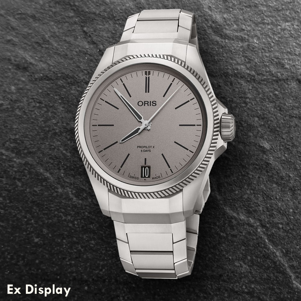 The Oris Pro Pilot X Mens Titanium Grey Dial 01 400 7778 7153-07 7 20 01TLC watch combines a 38mm round shaped titanium case and silver stainless-steel bracelet with a push button deployment clasp. It has a grey analogue dial with luminescent hands, date display which is protected beneath double sided anti reflective sapphire crystal glass. Power is generated by the automatic movement which has a power reserve of 120 hours. Watch has a water resistance of 100 metres