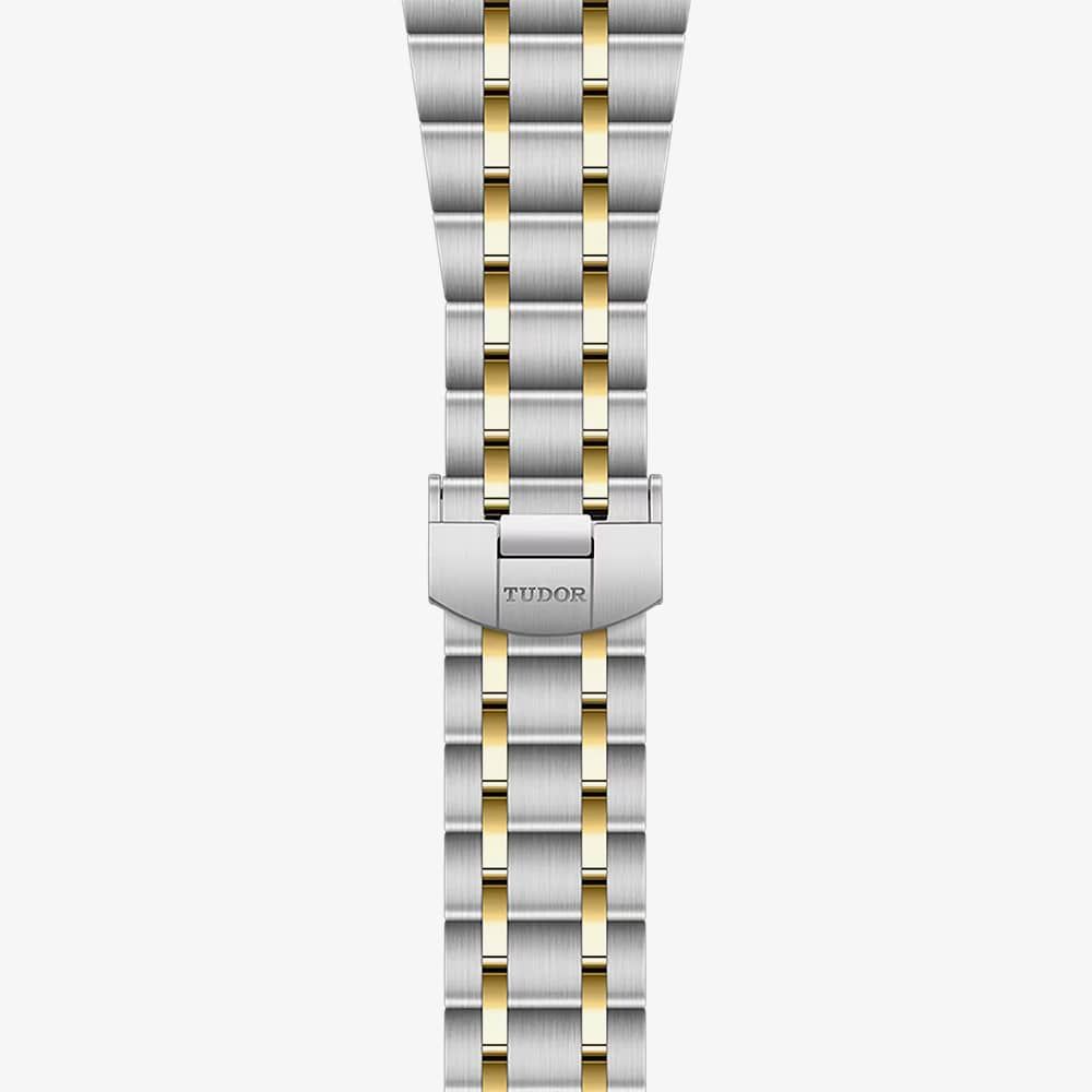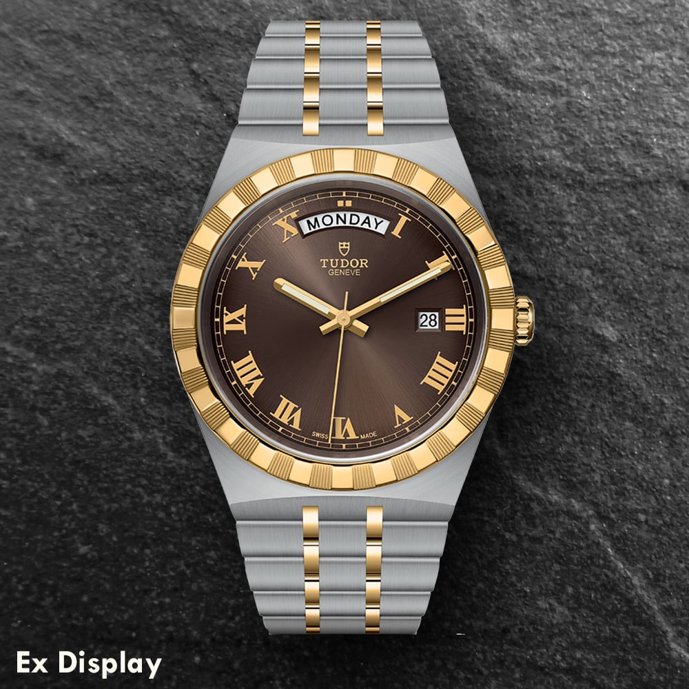The TUDOR Royal Watch features a integrated two tone 18k yellow gold and stainless steel bracelet with a stainless-steel fold over clasp. This watch features a new chocolate brown dial that is gorgeous and sophisticated to look at. Combined with the yellow gold hour markers and hands this watch is as luxurious as it gets.