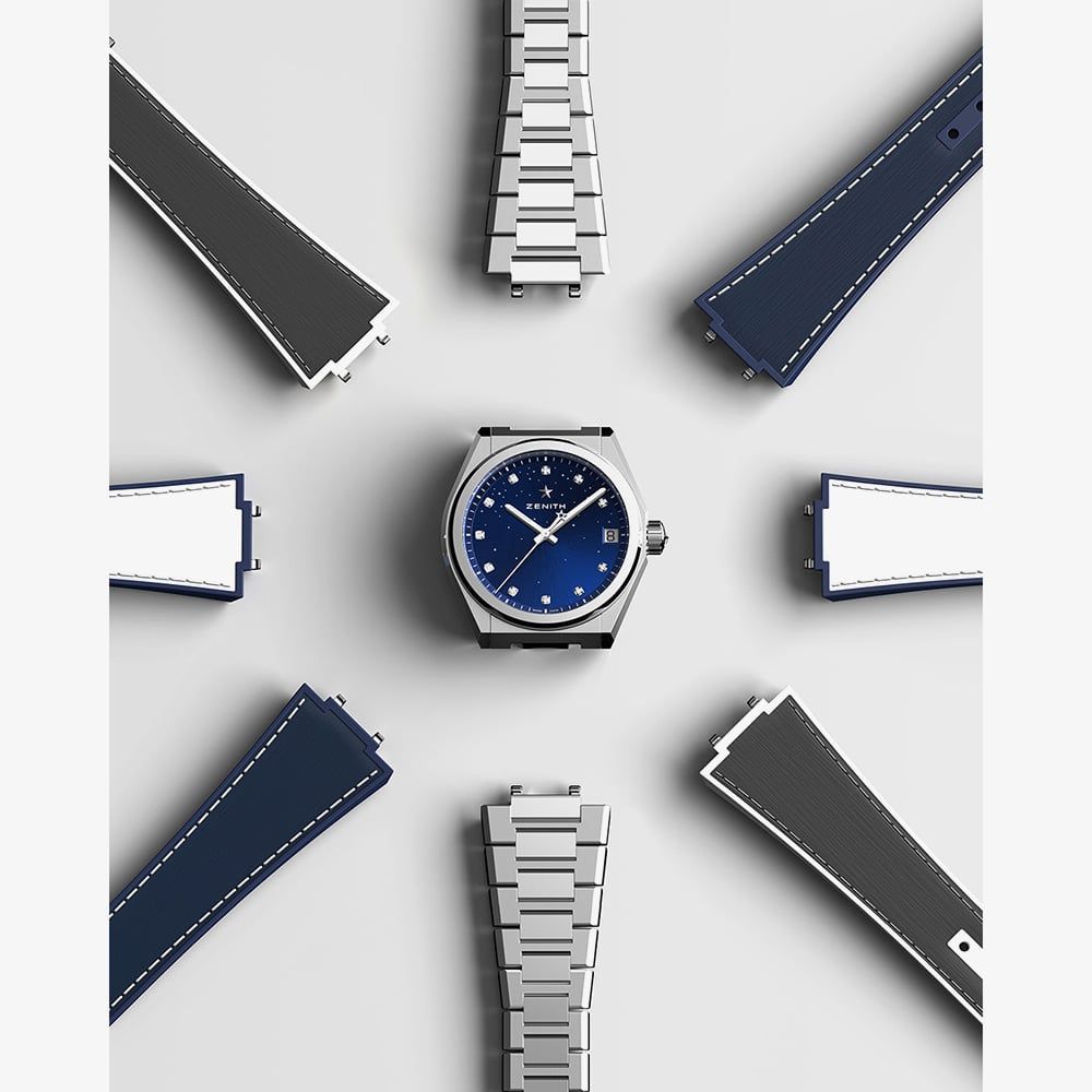The New Zenith DEFY Midnight defines contemporary femininity, made from the ground up exclusively for women. With its elegant faceted steel case and an assortment interchangeable straps to choose from, the Zenith DEFY Midnight is the perfect companion for today's confident woman. Sized at a modern 36mm, the faceted case is made in stainless steel and is presented on a steel bracelet with secure folding buckle. The vertical gradient blue dial depicts a starry night sky and is adorned by eleven beautifully set diamonds.