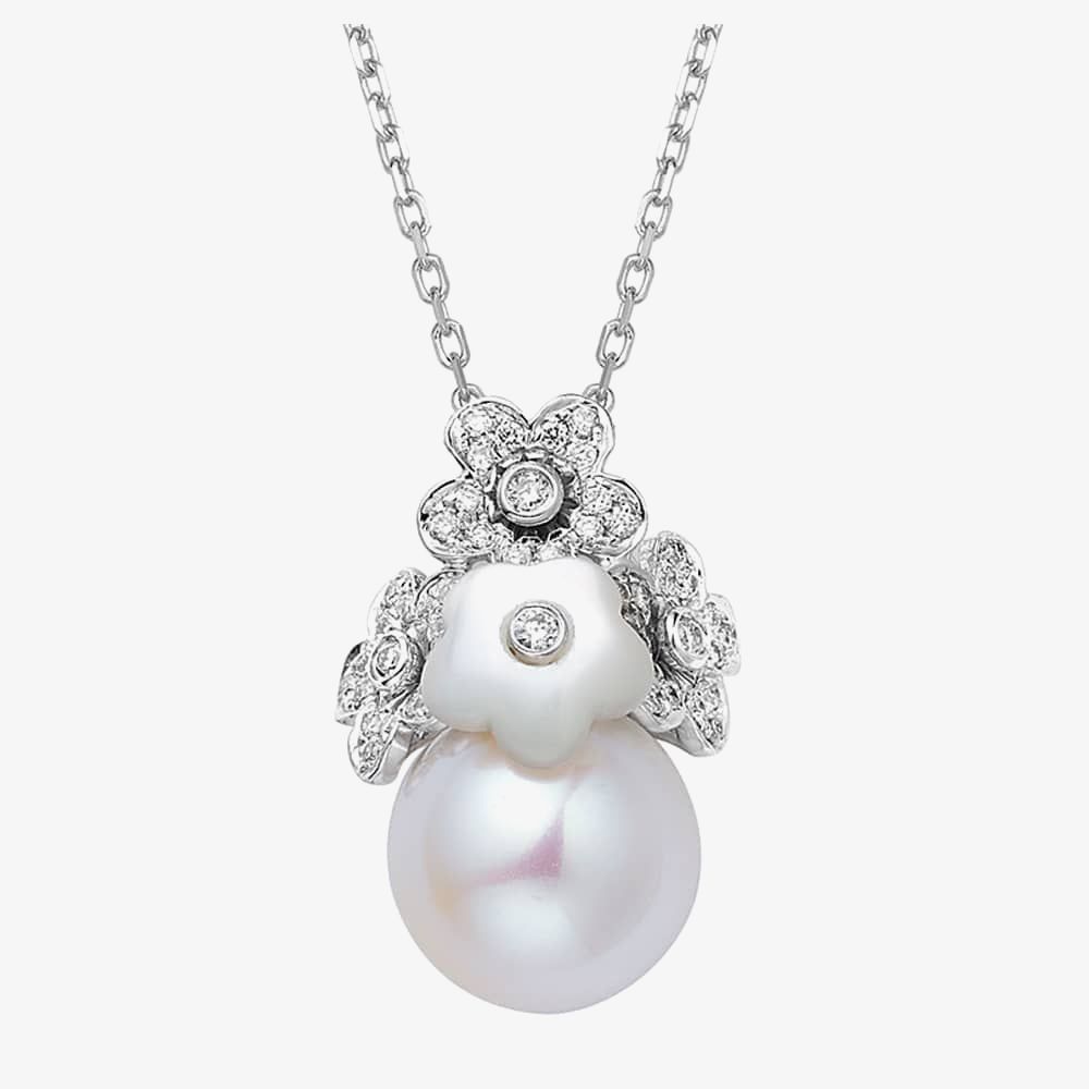 From the Alyssum collection, a graceful cluster pendant crafted in 18ct white gold featuring a delicate cluster of mother of pearl & 0.11ct Diamond flowers finished with 9-9.5 mm round freshwater pearl.