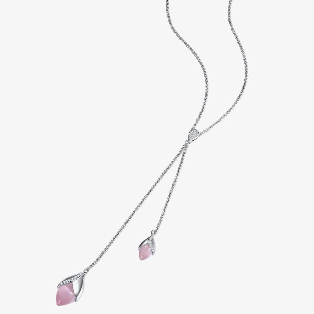 Fei Liu Magnolia Collection lariat necklace MAG-925R-303-CEPK measures 16-18 inch and is made from sterling silver set in white rhodium plating. This beautiful necklace features two pink quartz cat’s eye gemstones (one 14mm x 8.5mm, the other 9mm x 5.5mm) and dewdrops of 8 hearts and 8 arrows cubic zirconia. The petals surrounding each quartz are finished with satin and a high polish to give that contemporary look for a modern woman.