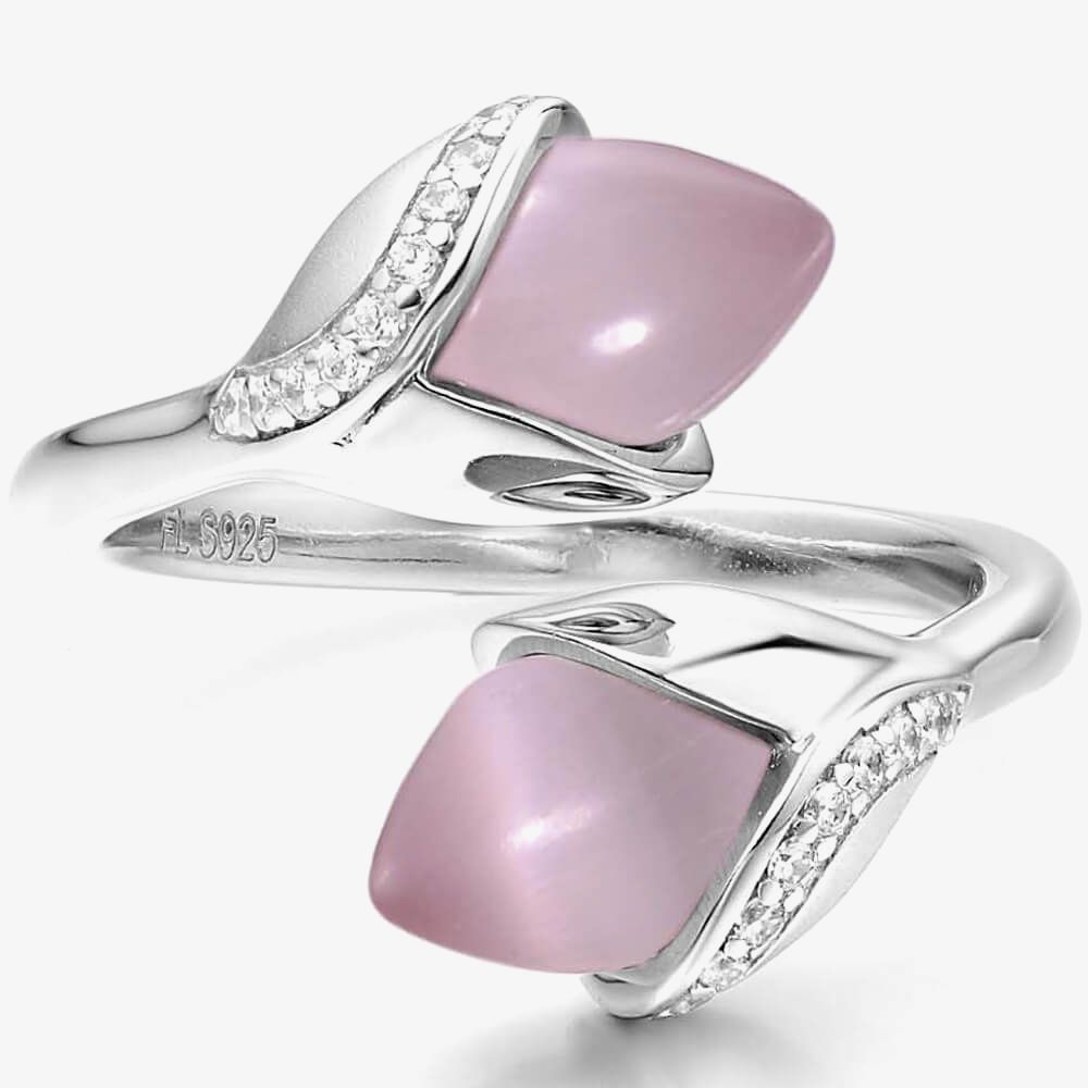 The Fei Liu Magnolia Double Stone Open Ring MAG-925R-002-CEPK features two pink cat's eye stones and sparkling cubic zirconia set in white rhodium plate on Sterling Silver.