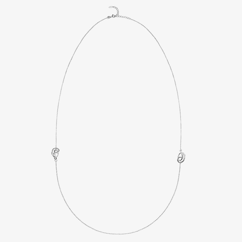 From the Serenity collection, an understated long rhodium plated sterling silver necklace featuring two infinity knots inspired by the flow and curves of the smoke of incense, promoting calm and peace.