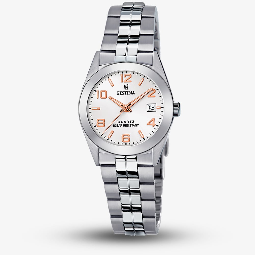 • 100 metre water resistance.Festinahttps://www.thbaker.co.uk/media/catalog/product/2/2/22-84-25157471_festina_02.jpg8430622735486condition:Nodisc_no_stock:Noex_display:Nosearch_keywords:WaterproofNoNoNoWaterproof228425157471FestinaF20438/4LadiesOfficial Festina Packaging2 Year Festina WarrantyClassicNoWatchSilverStainless Steel BraceletStainless SteelRound8.5mm28mmAnalogueMineral Crystal GlassSilverSilver100 metresQuartzPush Button Deployment Clasp69.33gNoNoNoNoYesYesNo{"name":"Klarna","text":"3 payments of \u00a328.33","imageUrl":"https:\/\/www.thbaker.co.uk\/media\/nosto\/klarna.png"}Festina Ladies Classics Rose Gold Detail Stainless Steel Bracelet Watch22-84-251574712026-03-23 00:00:000[{"path":"\/Watches","url":"\/watches\/"},{"path":"\/Watches\/Ladies Watches","url":"\/ladies-watches\/"},{"path":"\/Watches\/Bracelet Watches","url":"\/bracelet-watches\/"},{"path":"\/Watches\/Quartz Watches","url":"\/quartz-watches\/"},{"path":"\/Watches\/Rose Gold Watches","url":"\/rose-gold-watches\/"},{"path":"\/Watches\/Classic Watches","url":"\/classic-watches\/"},{"path":"\/Watches\/Waterproof Watches","url":"\/waterproof-watches\/"},{"path":"\/Brands A-Z\/Festina Watches","url":"\/festina-watches\/"},{"path":"\/Brands A-Z\/Festina Watches\/Festina Ladies","url":"\/festina-ladies-watches\/"},{"path":"\/Brands A-Z\/Festina Watches\/Festina Classics","url":"\/festina-classics-watches\/"},{"path":"\/Brands A-Z\/Festina Watches\/Festina Bracelet","url":"\/festina-bracelet-watches\/"},{"path":"\/Brands A-Z\/Festina Watches\/Festina Latest Launches","url":"\/festina-latest-launches\/"}]2026-03-23