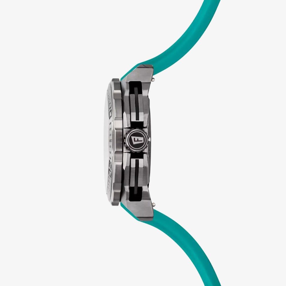 The Festina Chrono Bike is designed for those who demand both performance and style. Its robust 45.5mm stainless steel case frames a sleek black dial with luminescent details, three chronograph subdials, and a date window at 6 o’clock. Powered by a precise MOS20 quartz movement and safeguarded by mineral crystal glass, it offers water resistance up to 20 ATM. Paired with a bold teal rubber strap and buckle, this timepiece combines durability, comfort, and a modern sporty look.