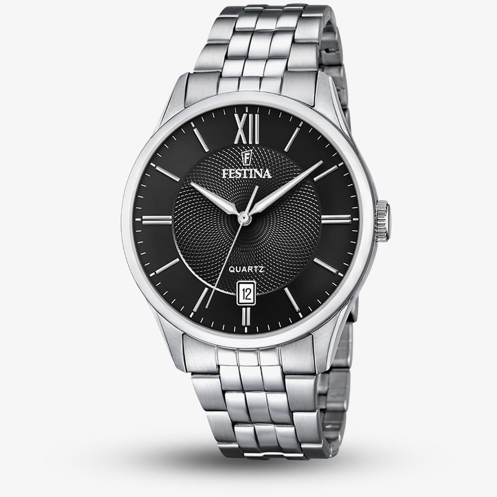 • 50 metre water resistance.Festinahttps://www.thbaker.co.uk/media/catalog/product/2/2/22-83-25157466_festina_02.jpg8430622730856condition:Nodisc_no_stock:Noex_display:NoNoNoNo228325157466FestinaF20425/3MensOfficial Festina Packaging2 Year Festina WarrantyClassicNoWatchSilverStainless Steel BraceletStainless SteelRound10.3mm43mmAnalogueMineral Crystal GlassBlackBlack50 metresQuartzPush Button Deployment Clasp111.20gNoNoNoNoYesYesNo{"name":"Klarna","text":"3 payments of \u00a331.67","imageUrl":"https:\/\/www.thbaker.co.uk\/media\/nosto\/klarna.png"}Festina Mens Classic Black Dial Bracelet Strap Watch22-83-251574662026-03-23 00:00:000[{"path":"\/Watches","url":"\/watches\/"},{"path":"\/Watches\/Mens Watches","url":"\/mens-watches\/"},{"path":"\/Seasonal\/Father's Day Gifts","url":"\/fathers-day-gift-ideas\/"},{"path":"\/Watches\/Bracelet Watches","url":"\/bracelet-watches\/"},{"path":"\/Watches\/Quartz Watches","url":"\/quartz-watches\/"},{"path":"\/Watches\/Classic Watches","url":"\/classic-watches\/"},{"path":"\/Brands A-Z\/Festina Watches","url":"\/festina-watches\/"},{"path":"\/Brands A-Z\/Festina Watches\/Festina Mens","url":"\/festina-mens-watches\/"},{"path":"\/Brands A-Z\/Festina Watches\/Festina Classics","url":"\/festina-classics-watches\/"},{"path":"\/Brands A-Z\/Festina Watches\/Festina Bracelet","url":"\/festina-bracelet-watches\/"},{"path":"\/Brands A-Z\/Festina Watches\/Festina Latest Launches","url":"\/festina-latest-launches\/"}]2026-03-23