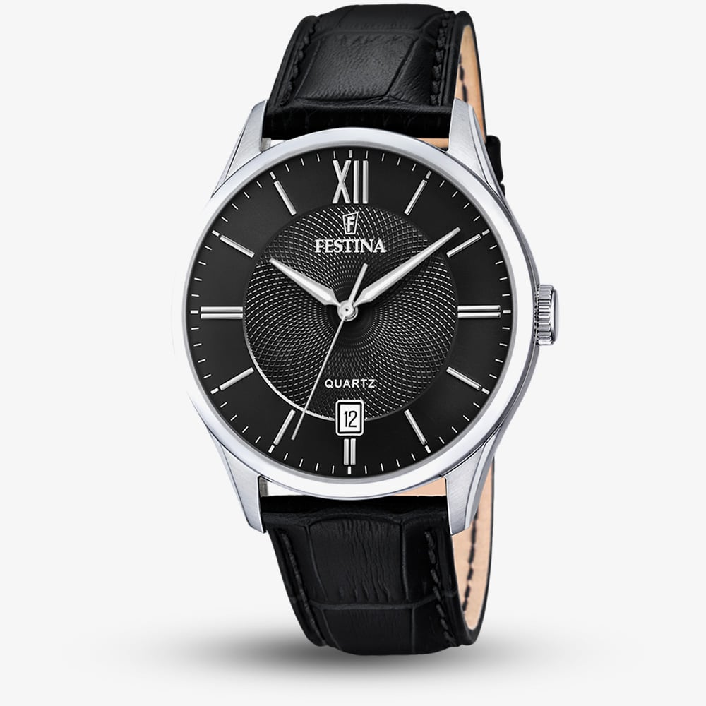 • 50 metre water resistance.Festina8430622730344add-to-cartcondition:Nodisc_no_stock:Noex_display:NoNoNoNo228325157468FestinaF20426/3MensOfficial Festina Packaging2 Year Festina WarrantyClassicNoWatchBlackLeather StrapStainless SteelRound10.3mm43mmAnalogueMineral Crystal GlassBlackBlack50 metresQuartzPin Buckle59.94gNoNoNoNoYesYesNo{"name":"Klarna","text":"3 payments of \u00a328.33","imageUrl":"https:\/\/www.thbaker.co.uk\/media\/nosto\/klarna.png"}Festina Mens Classics Black Leather Strap Watch22-83-251574682026-03-23 00:00:000[{"path":"\/Watches","url":"\/watches\/"},{"path":"\/Watches\/Mens Watches","url":"\/mens-watches\/"},{"path":"\/Seasonal\/Father's Day Gifts","url":"\/fathers-day-gift-ideas\/"},{"path":"\/Watches\/Strap Watches\/Leather Strap Watches","url":"\/leather-strap-watches\/"},{"path":"\/Watches\/Quartz Watches","url":"\/quartz-watches\/"},{"path":"\/Watches\/Classic Watches","url":"\/classic-watches\/"},{"path":"\/Watches\/Strap Watches","url":"\/strap-watches\/"},{"path":"\/Brands A-Z\/Festina Watches","url":"\/festina-watches\/"},{"path":"\/Brands A-Z\/Festina Watches\/Festina Mens","url":"\/festina-mens-watches\/"},{"path":"\/Brands A-Z\/Festina Watches\/Festina Classics","url":"\/festina-classics-watches\/"},{"path":"\/Brands A-Z\/Festina Watches\/Festina Strap","url":"\/festina-strap-watches\/"},{"path":"\/Brands A-Z\/Festina Watches\/Festina Latest Launches","url":"\/festina-latest-launches\/"}]2026-03-23
