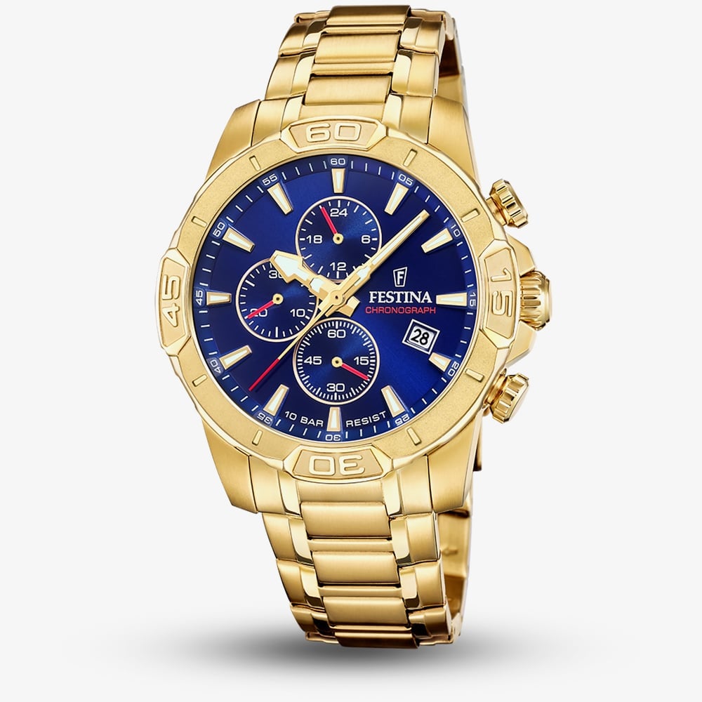 Festina Mens Timeless Chronograph Gold Tone Blue Dial Watch F20705/3