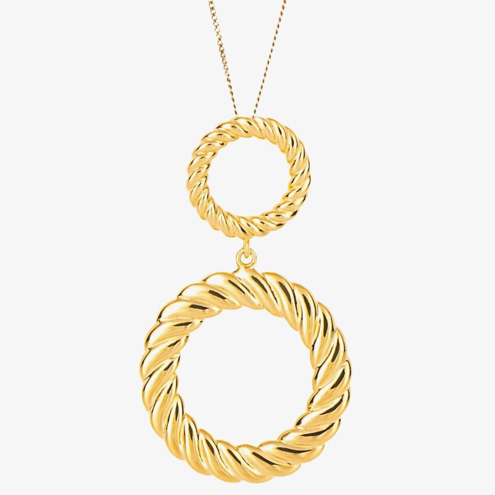 This double drop circle pendant is constructed in recycled sterling silver with a yellow gold plating, with an adjustable chain length of 41cm-46cm. Perfect for day or night, this combination of a hoop silhouette and a twisted rope design would be a wonderful gift for someone special or a treat for yourself.