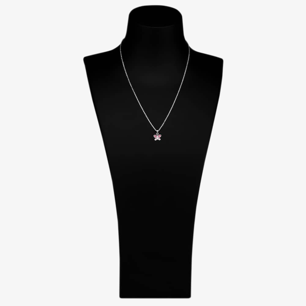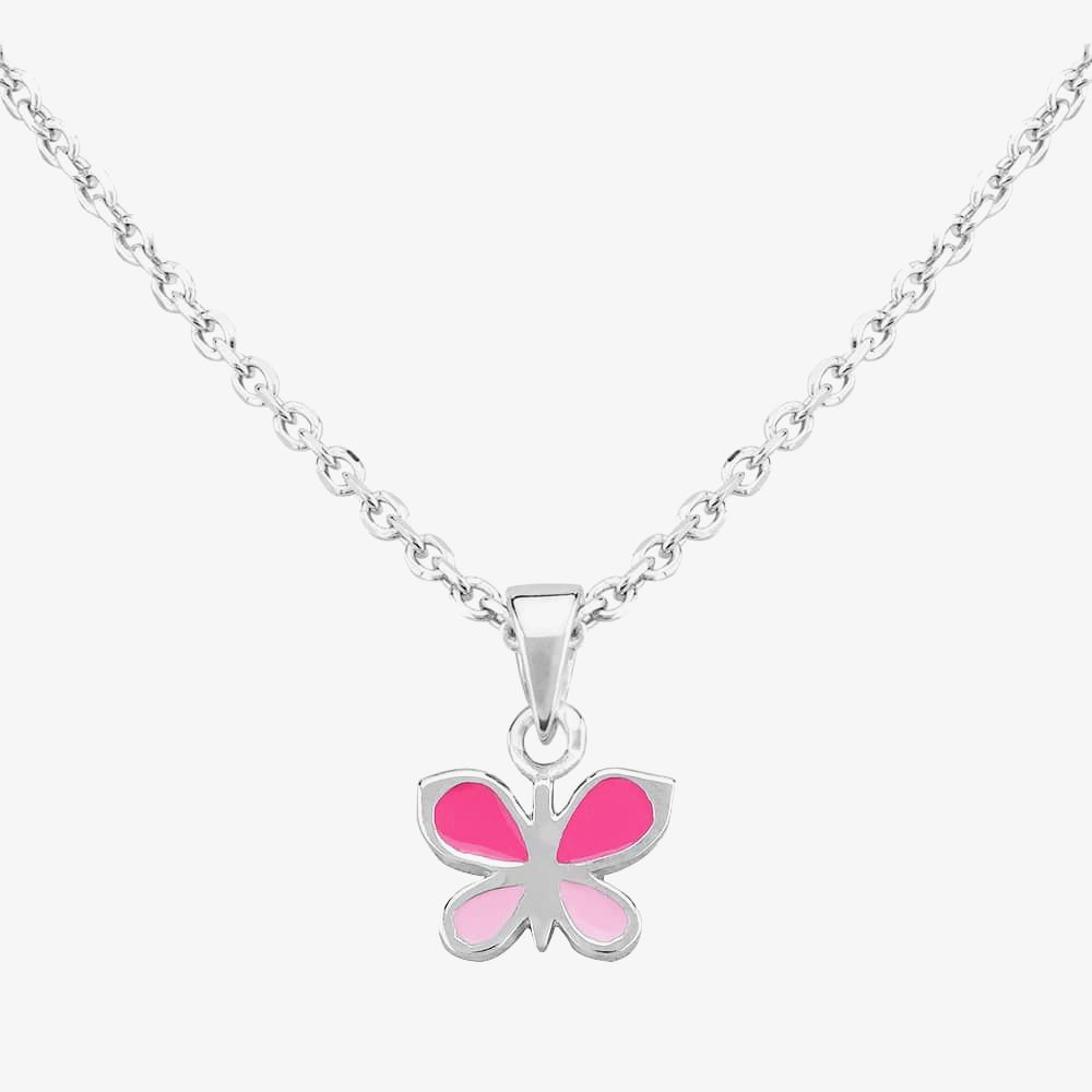 This beautifully delicate butterfly pendant features soft pink accents for a lovely finish to any outfit. Crafted in sterling silver the pretty pink butterfly pendant sits upon a oval cable link chain. Part of the Fleur collection made especially for children, the chain is finished with a spring clasp for easy wear and safe removal. Wear individually or pair with matching earrings from the collection to complete the look, flutter by butterfly.