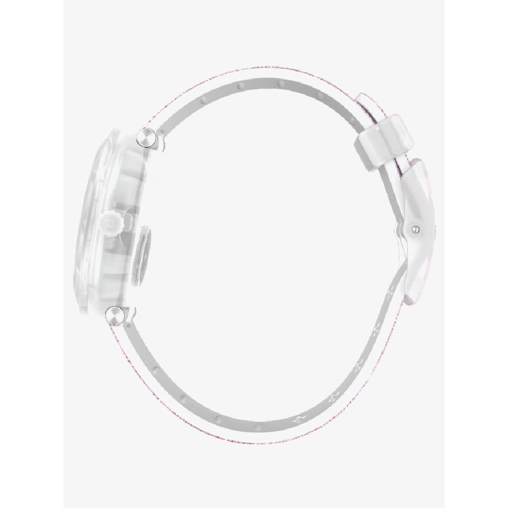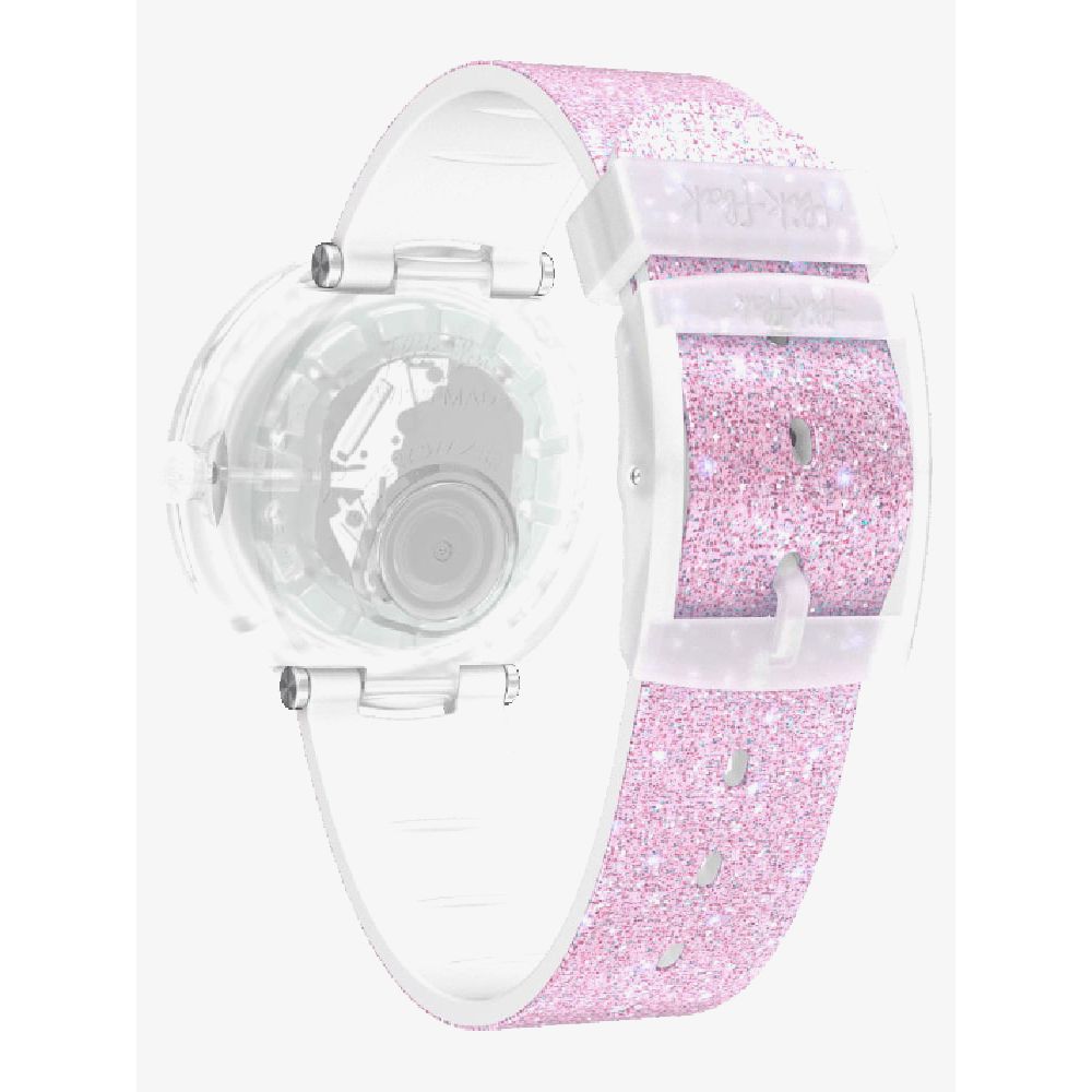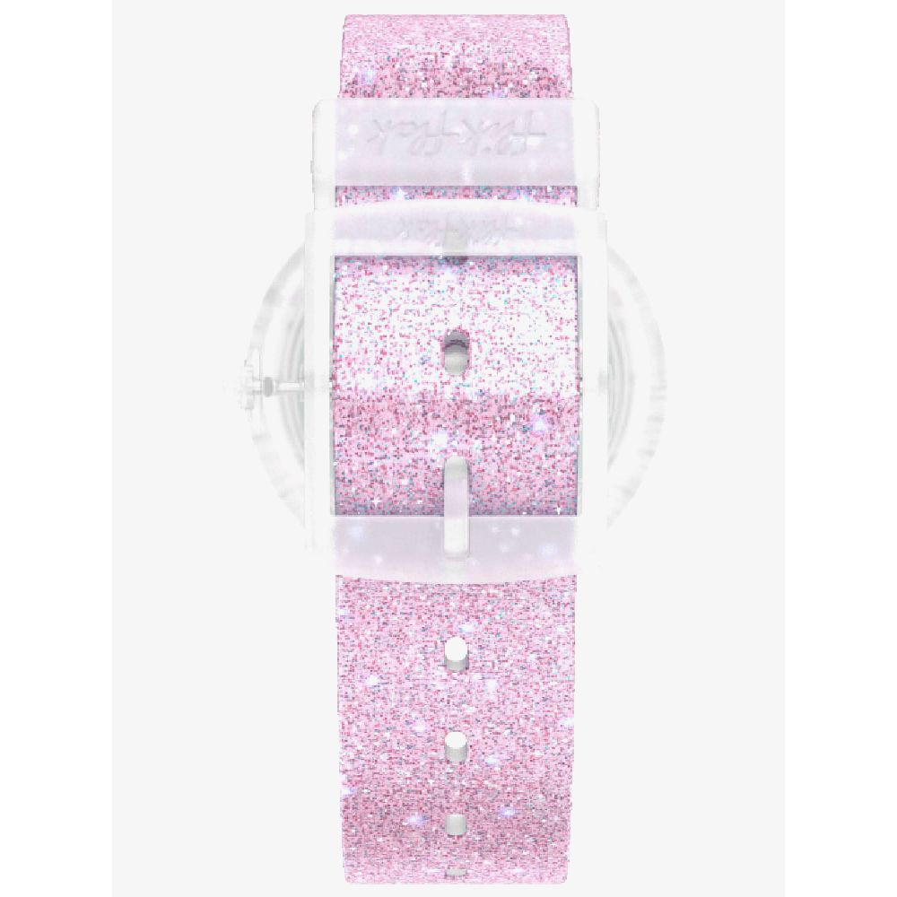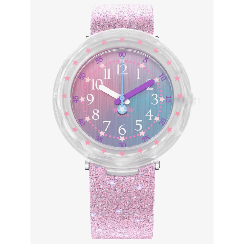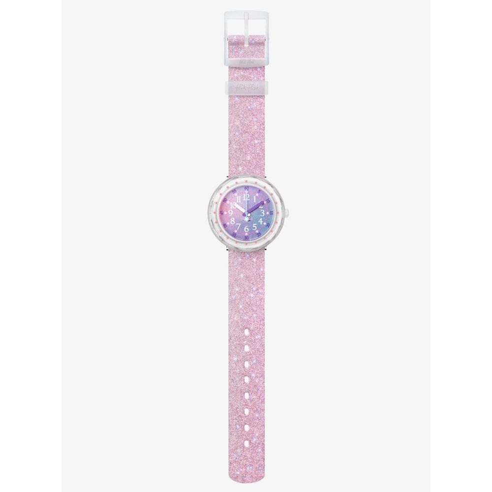 This Childrens metallic effect glitter watch is bought to us by Flik Flak. Featuring a round pink dial with a transparent plastic case with star design. It is completed with a white and pink glitter rubber strap with traditional buckle fastening.