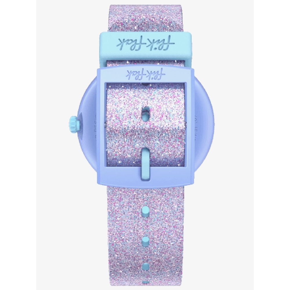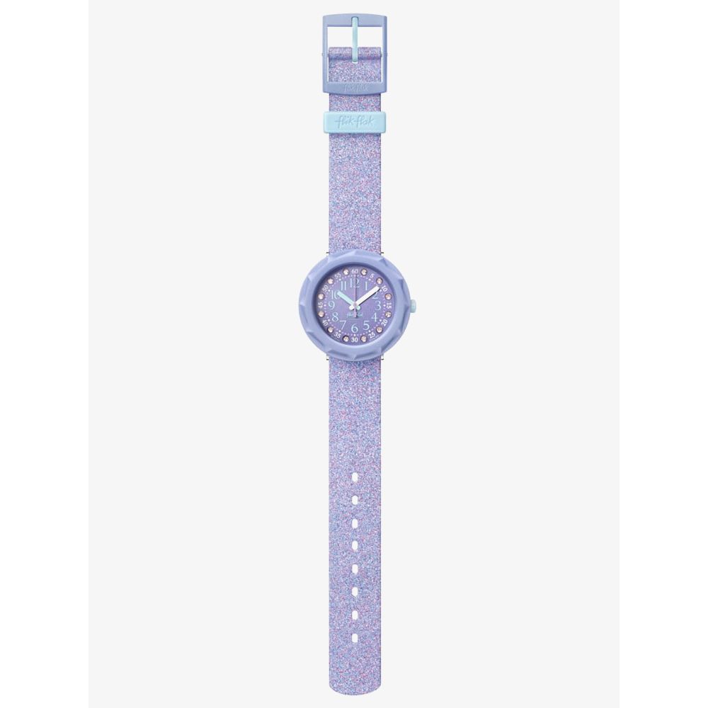 This purple glitter rubber strap watch from Flik Flak has a purple plastic case and a purple dial with sparkling gemstones. It is water resistant up to 30 metres and has a traditional buckle fastening.