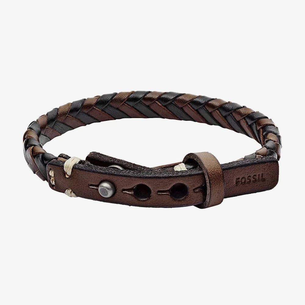 Crafted from genuine brown and black leather, the Fossil Bronson Vintage Casual Braided Bracelet offers a rugged yet refined look. Featuring a secure pin clasp, this versatile accessory adds timeless style to any casual outfit.