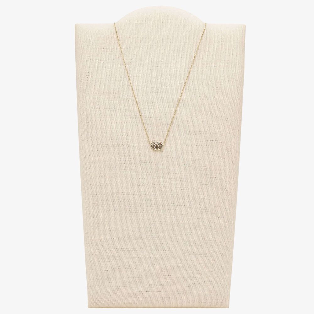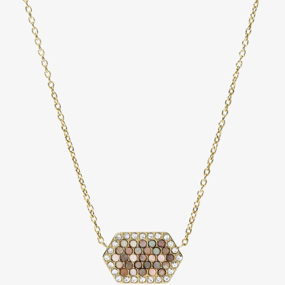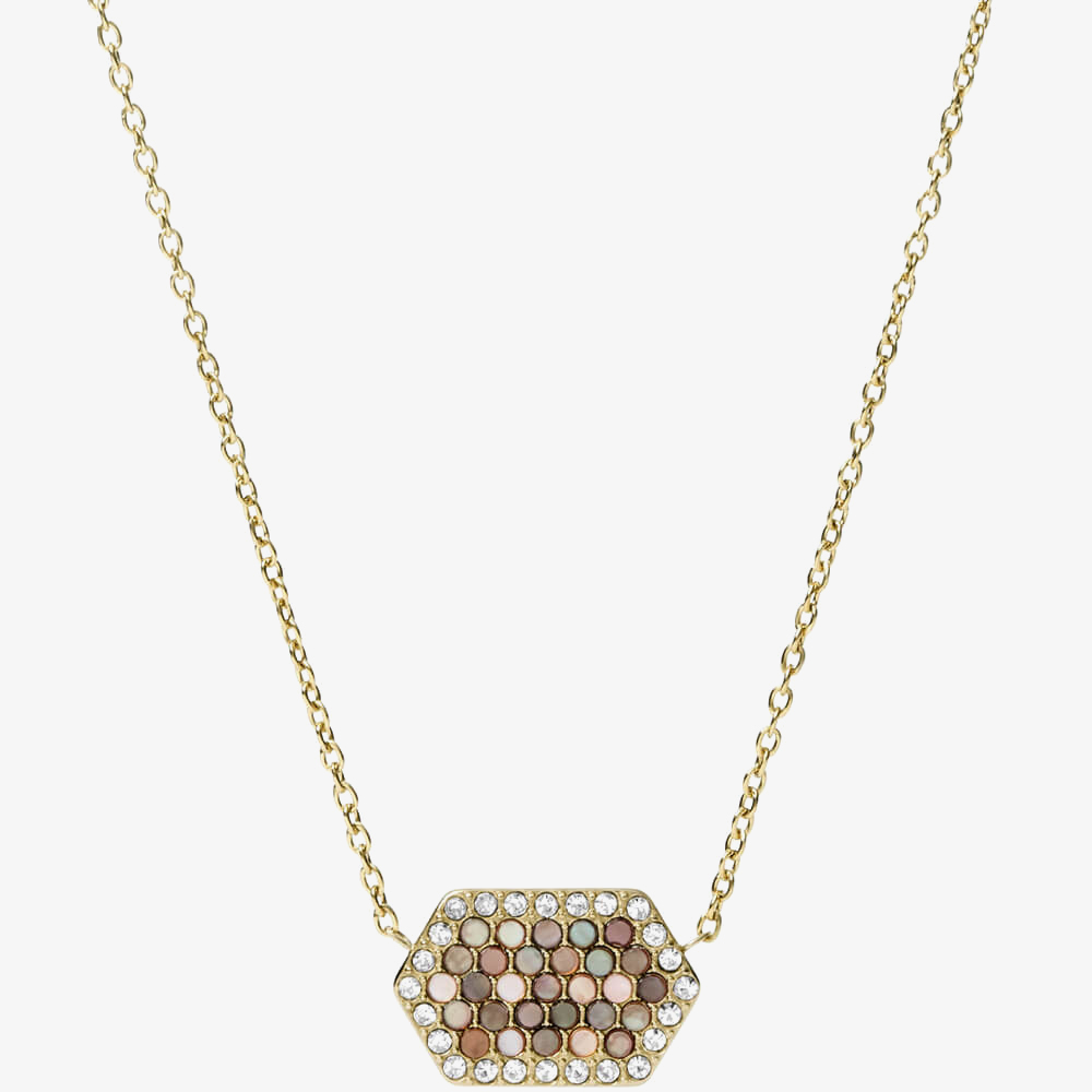 The Fossil Val Holiday Sparkles Gold Tone Hexagon Necklace JF03864710 is created in stainless steel. This gold tone necklace features a beautiful hexagon motif set with multiple stones in multiple colours, including beautiful mother of pearl accents. It is 420mm + 50mm in length and is completed with a lobster clasp.