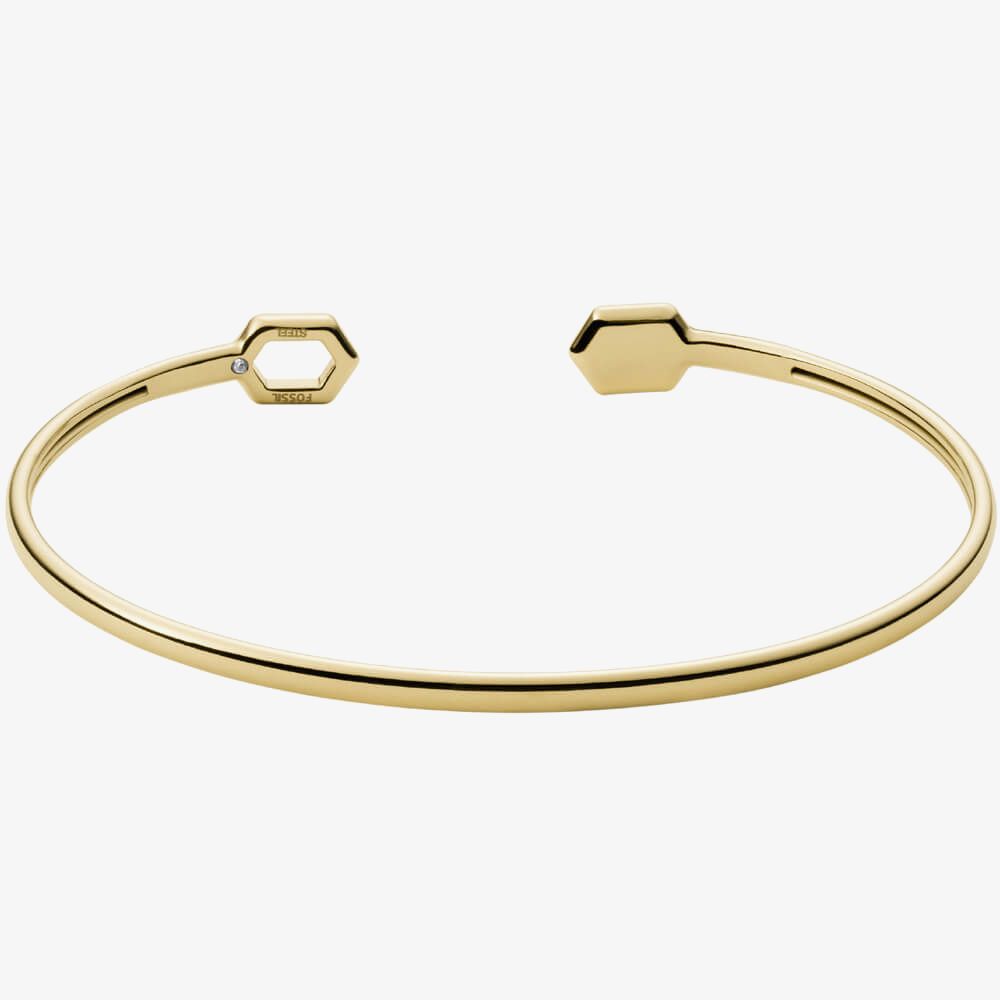 The Fossil Val Holiday Sparkles Gold Tone Hexagon Open Bangle JF03862710 is created in stainless steel. The gold tone open bangle features a sparkling multi-stone hexagon motif, including beautiful mother of pearl accents and an open hexagon design.