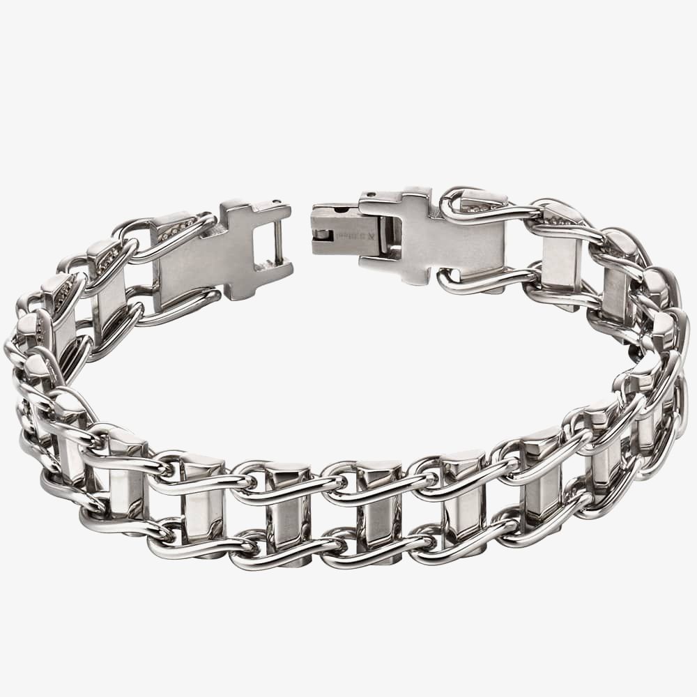 Crafted in stainless steel, this eye catching bracelet features a robust bike chain design and is finished with a fold over clasp fastening.