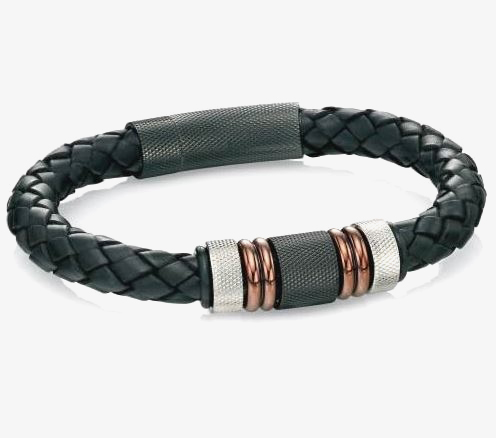 Fred Bennett jewellery containing timeless classics and contemporary new designs in sterling silver and stainless steel. This black leather bracelet with a rose gold plated bead in the centre reflects style, and would make the perfect gift for your loved one.