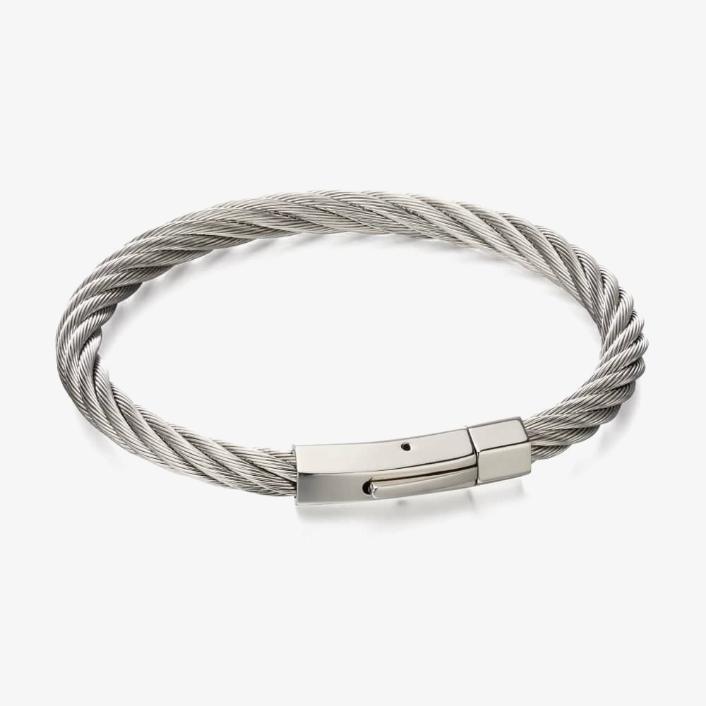 A thick, bold twist on a classic bracelet design made from stainless steel cable which measures 21.5cm in length.