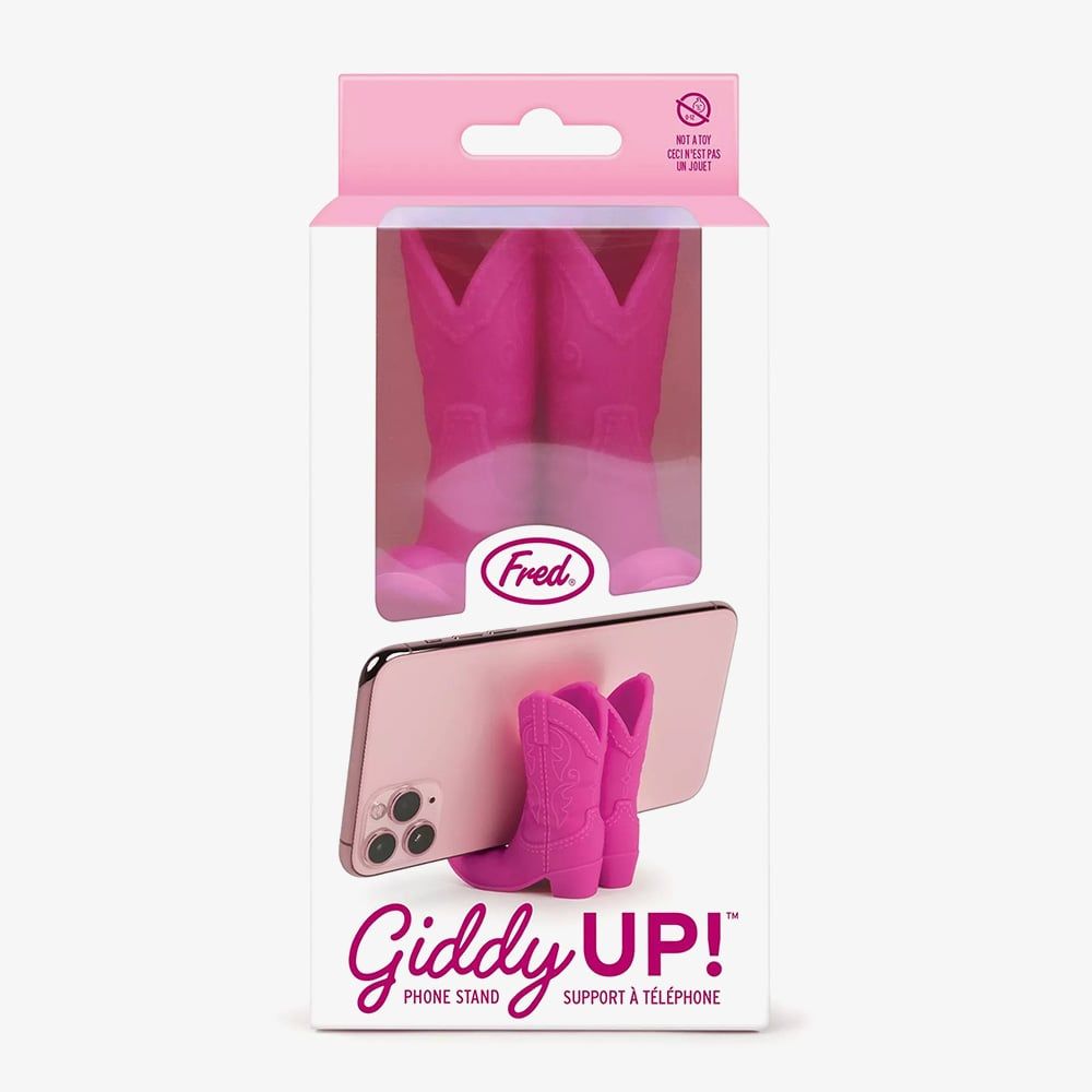 Add a fun and functional touch to your desk with the Fred Giddy Up Cowboy Boot Phone Stand. This quirky pair of pink cowboy boots, made from durable silicone, holds most smartphones securely in portrait or landscape orientation. A playful and practical accessory, it’s perfect for keeping your device handy while adding a pop of personality to any space.