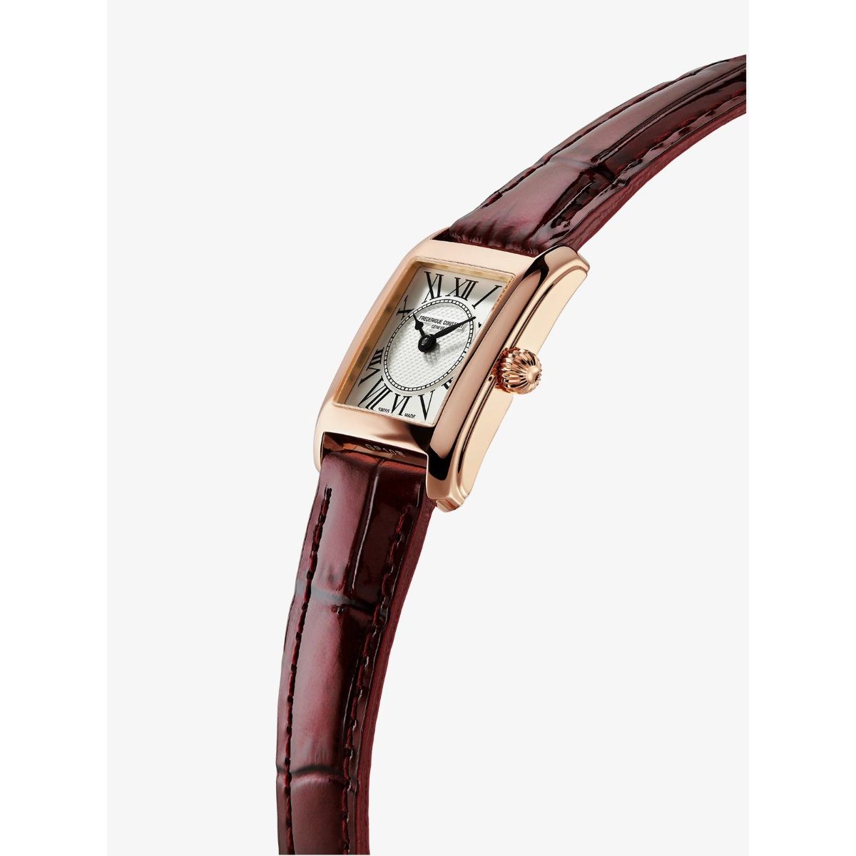 The Frederique Constant Ladies Caree Classics FC-200MC14 watch combines a 23mm rectangle shaped stainless steel case and red leather strap with a traditional buckle. It has a white analogue dial which is protected beneath sapphire crystal glass. Power is generated by the quartz movement. This model also has a water resistance of up to 30 metres.