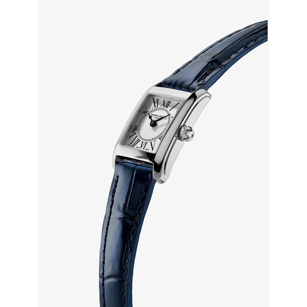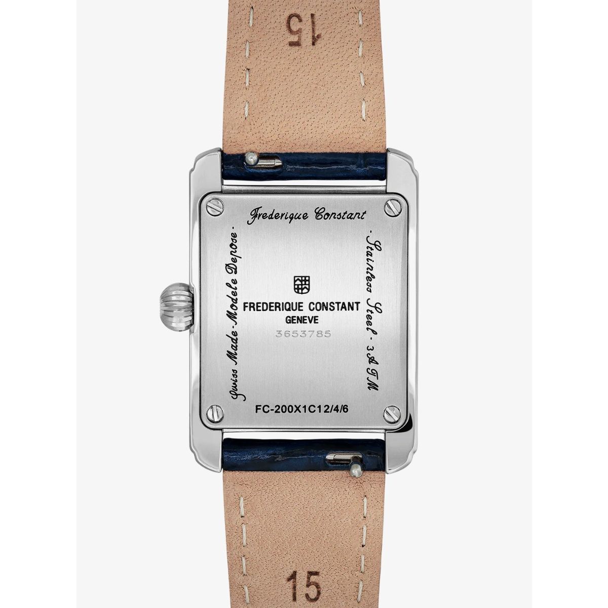 The Frederique Constant Ladies Carree Classics Blue Strap FC-200MC16 watch combines a 23mm rectangle-shaped stainless steel case and a blue leather strap with a traditional buckle. It has a white analogue dial which is protected beneath sapphire crystal glass. Power is generated by the quartz movement. This model also has a water resistance of up to 30 metres.