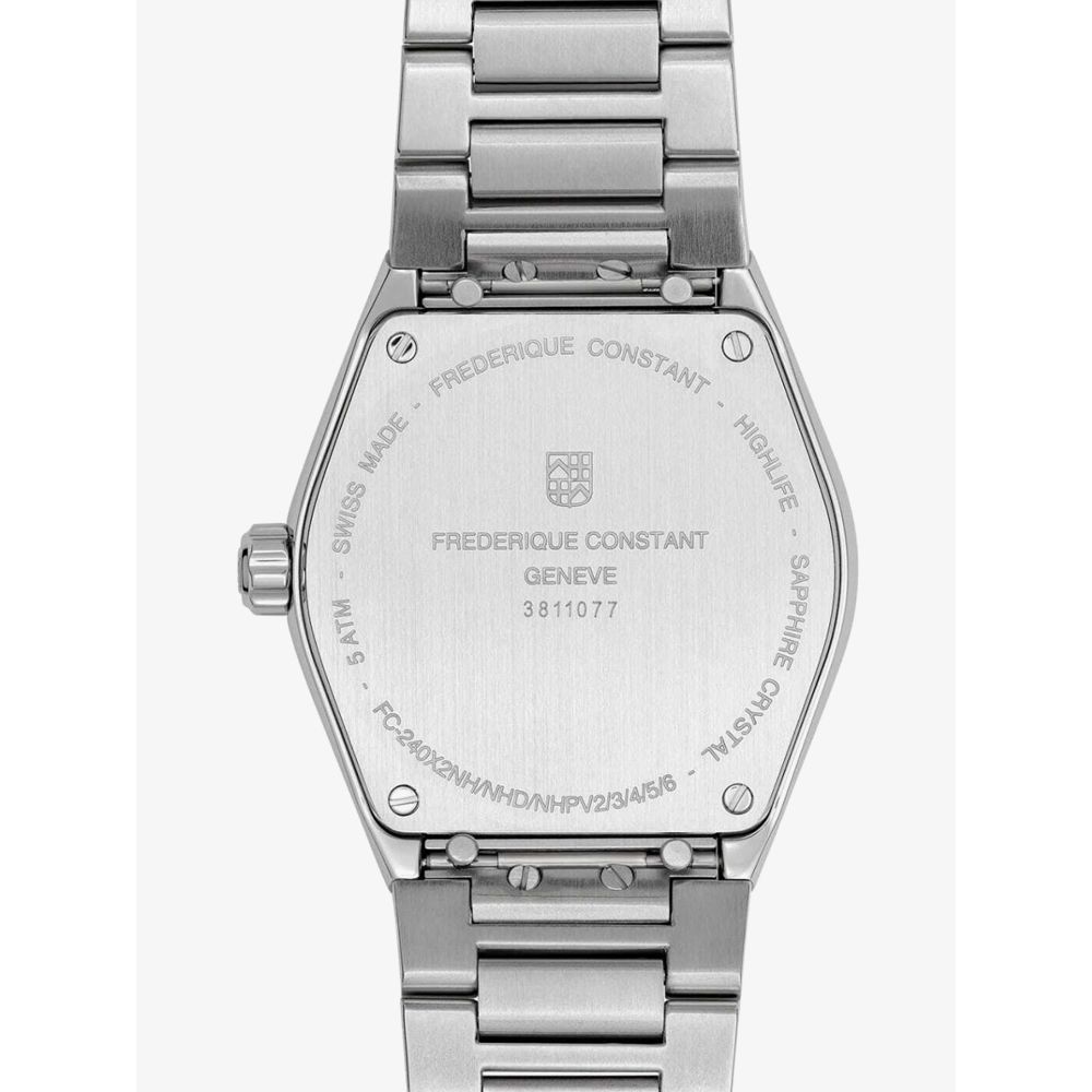 The Frederique Constant FC-240SD2NH6B watch combines a 31mm round shaped stainless steel case and silver stainless steel bracelet with a push button deployment clasp. It has a silver analogue dial with luminescent hands, date display which is protected beneath scratch resistant sapphire crystal glass. Power is generated by the quartz movement. This model also has a water resistance of up to 50 metres.