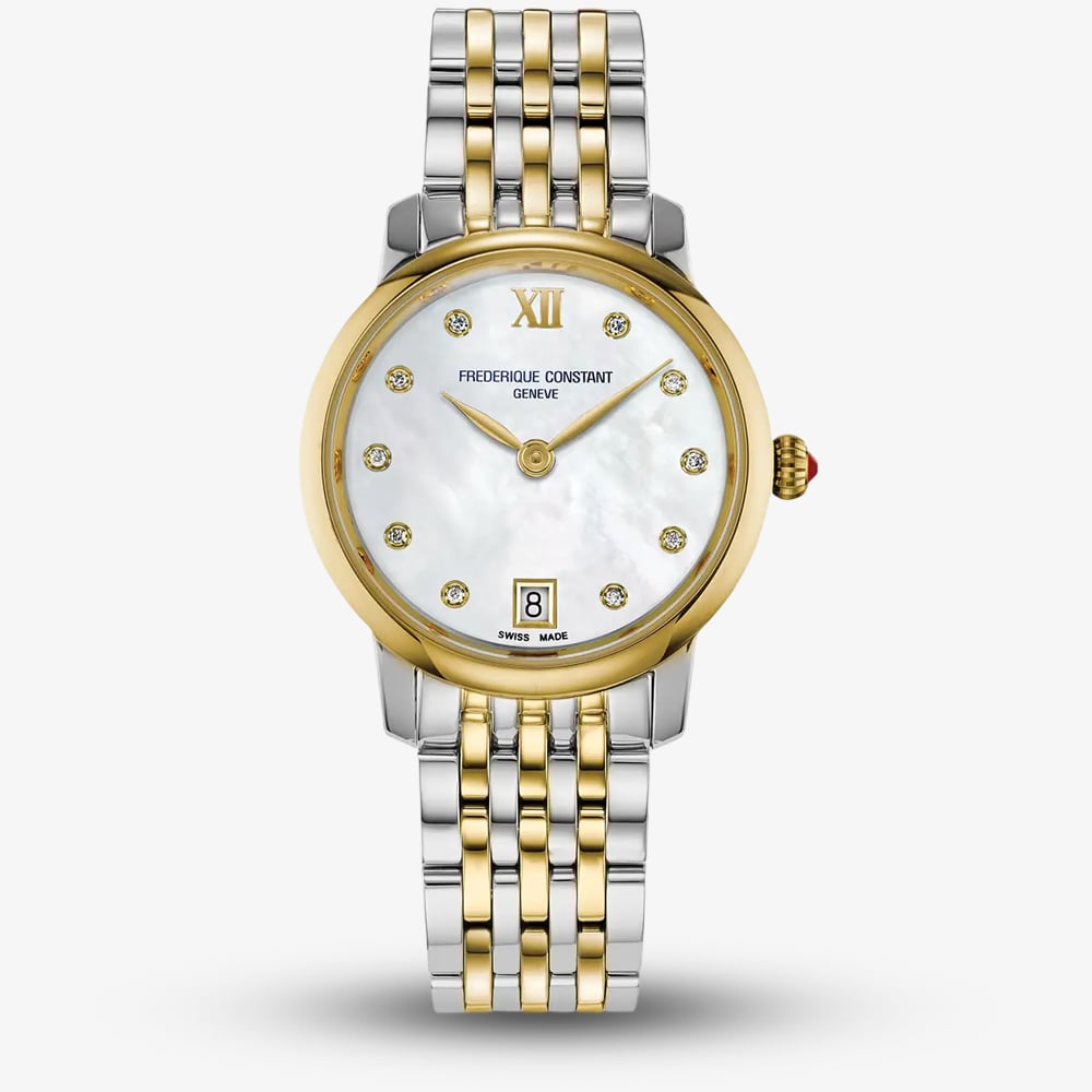 A refined timepiece perfect for those who appreciate subtle luxury. The two-tone stainless steel bracelet offers a versatile and sophisticated look. It pairs effortlessly with both daywear and evening attire, making it the perfect accessory for any occasion. At the heart of this watch is a stunning mother-of-pearl dial, radiating a soft, iridescent glow. Diamond hour markers add just the right touch of sparkle. With its ultra-slim profile, this watch sits comfortably on the wrist, offering lightweight elegance throughout the day.
