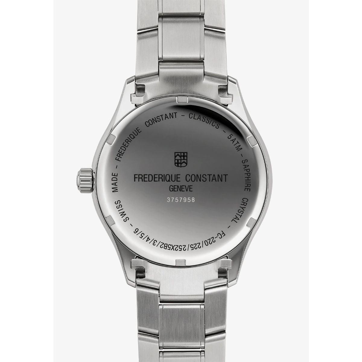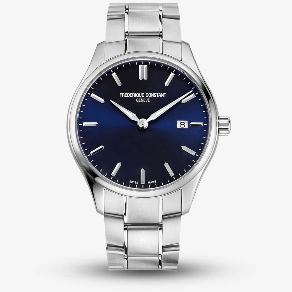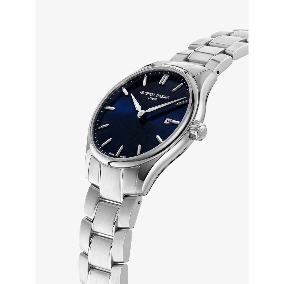 The Frederique Constant Mens Classic Blue Dial & Silver Strap FC-220NS5B6B watch combines a 40mm round shaped stainless steel case and silver stainless steel bracelet with a push button deployment clasp. It has a blue analogue dial which is protected beneath sapphire crystal glass. Power is generated by the quartz movement. This model also has a water resistance of up to 50 metres.