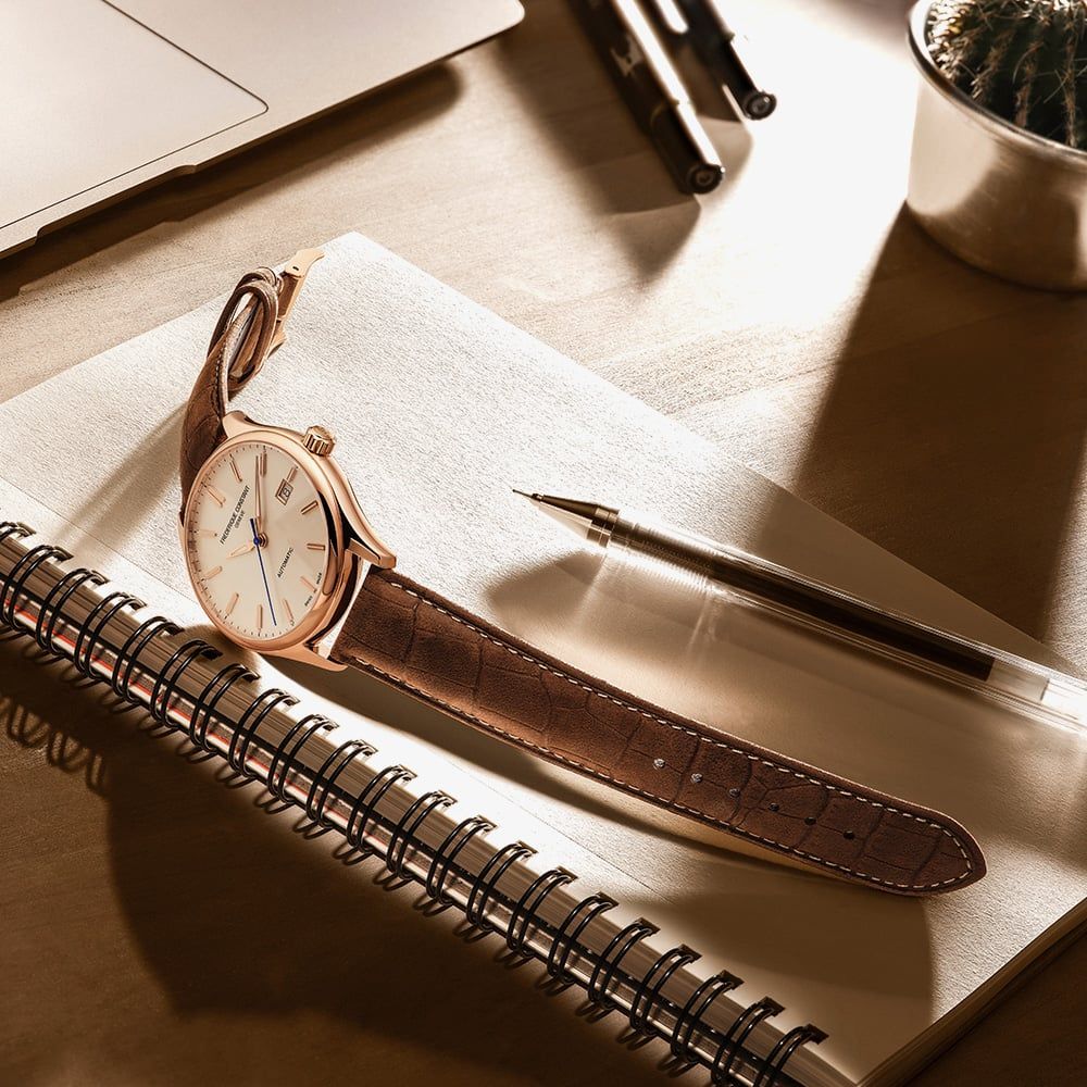 Featuring a clean white dial with polished rose gold-tone indices and hands, this watch makes a bold yet sophisticated statement. The clean design is easy to read and perfect for both everyday wear and special occasions. Encased in warm rose gold-plated stainless steel, it adds a touch of richness and distinction to your wrist. The luxurious brown leather strap offers a comfortable fit with a luxurious finish, completing the watch’s classic silhouette.