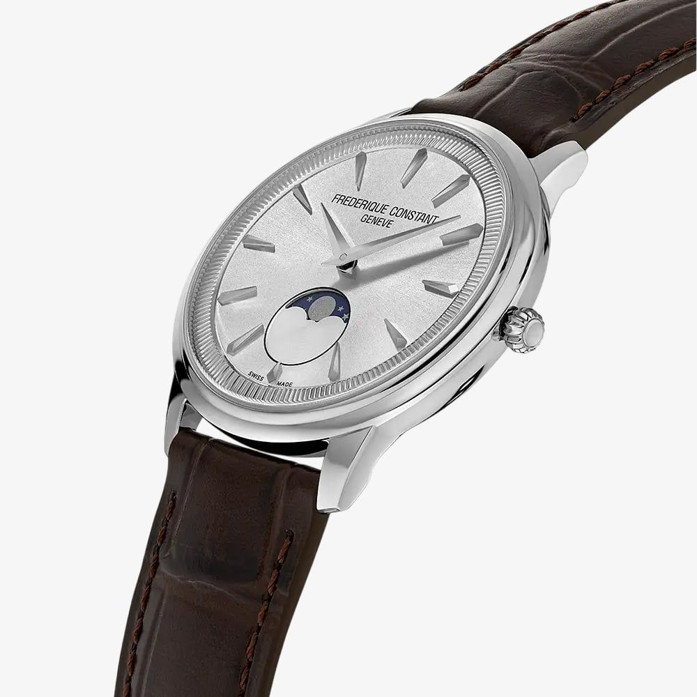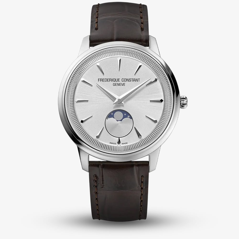This timepiece balances timeless aesthetics with functional sophistication. The crisp silver dial features refined silver-tone hands and slender hour markers, delivering a clean and minimalist look. A beautifully designed moonphase display adds a touch of complexity—capturing the charm of traditional watchmaking in a modern form. Made from polished stainless steel, this watch boasts a sleek profile. The black leather strap provides a classic contrast, offering both comfort and a tailored finish that transitions seamlessly from day to night.