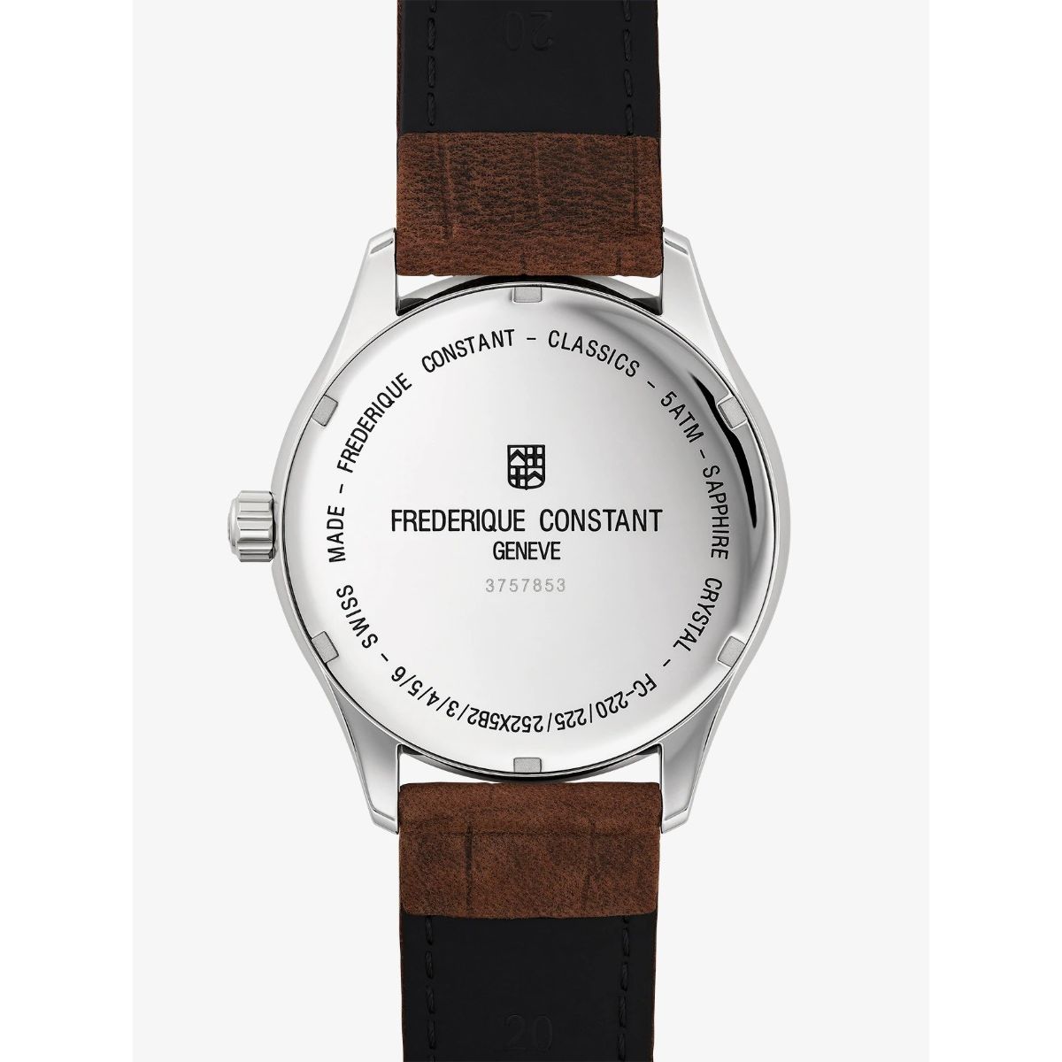 The Frederique Constant Mens Classic Silver Dial FC-220SS5B6 watch combines a 40mm round shaped stainless steel case and brown leather strap with a traditional buckle. It has a silver analogue dial which is protected beneath sapphire crystal glass. Power is generated by the quartz movement. This model also has a water resistance of up to 50 metres.