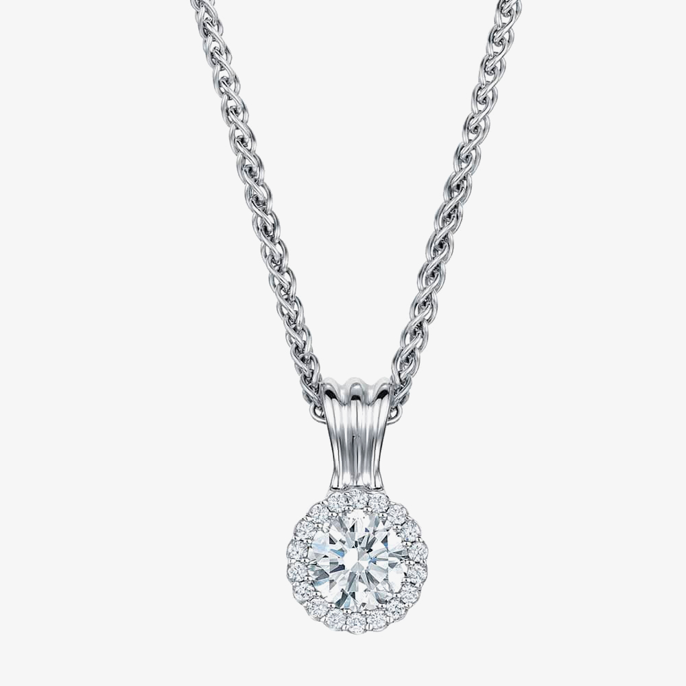 From the Cannelé collection, a truly classic cluster pendant crafted in 18ct white gold set with a round brilliant diamond with a smaller round brilliant diamond halo surround finished with a 16inch Spiga chain.