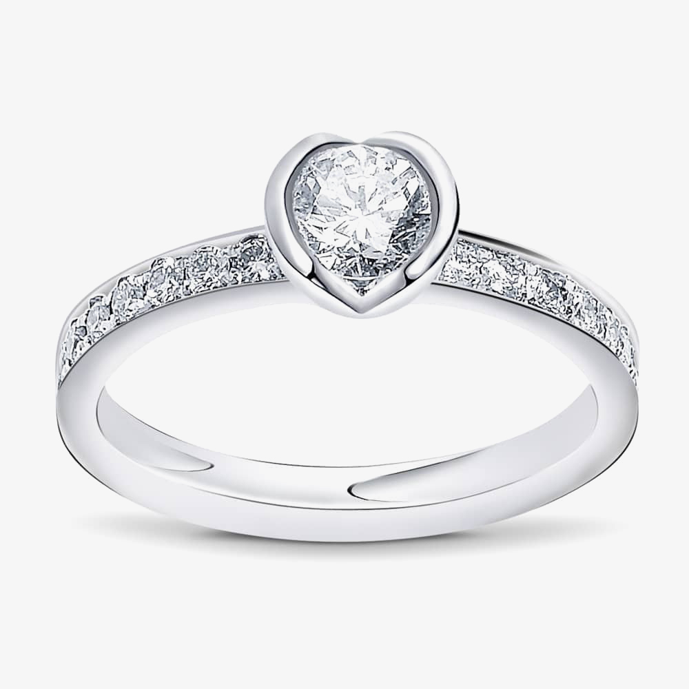 From the Fission collection, a sparkling solitaire ring crafted in Platinum with a rubover setting round brilliant centre stone with channel set round brilliant diamond shoulders.