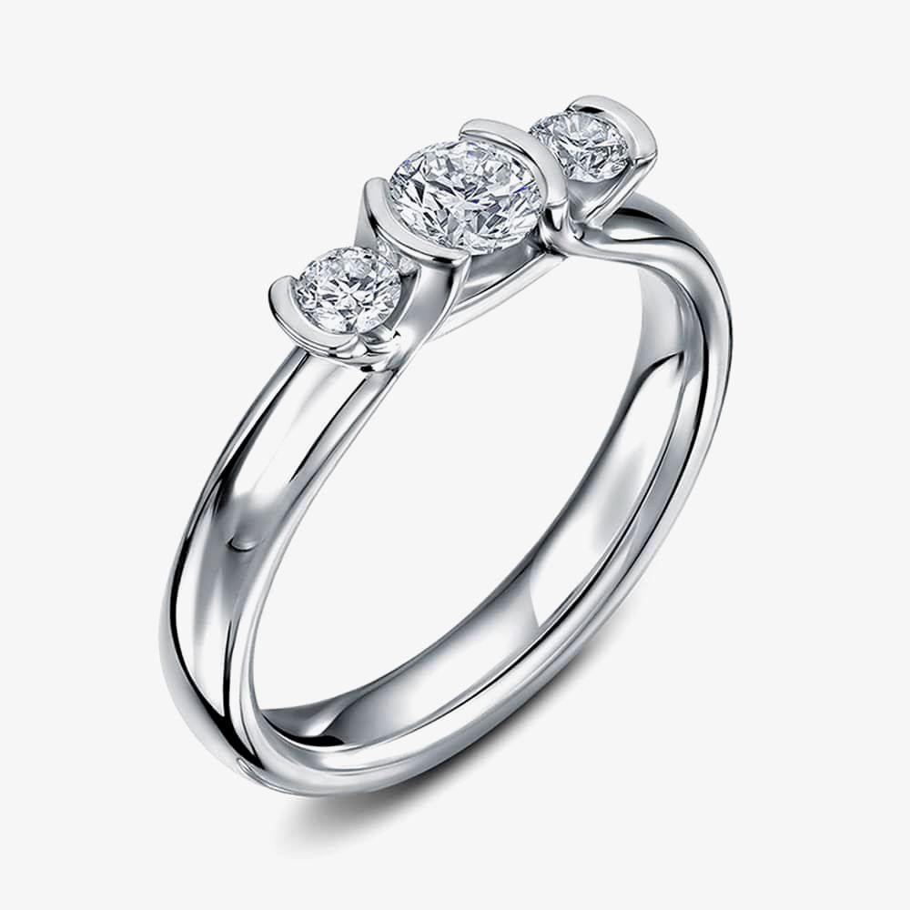 From the Triumph collection, a beautiful rubover/ tension set trilogy ring set in platinum with three round brilliant diamonds with a substantial shoulder setting and shank.