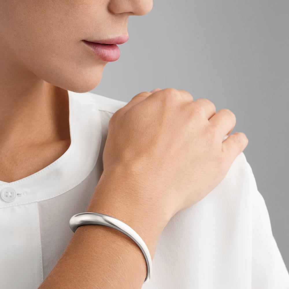 Georg Jensen Offspring Open Medium Bangle 20000131000M measures 6.5 inches and is made from sterling silver.
