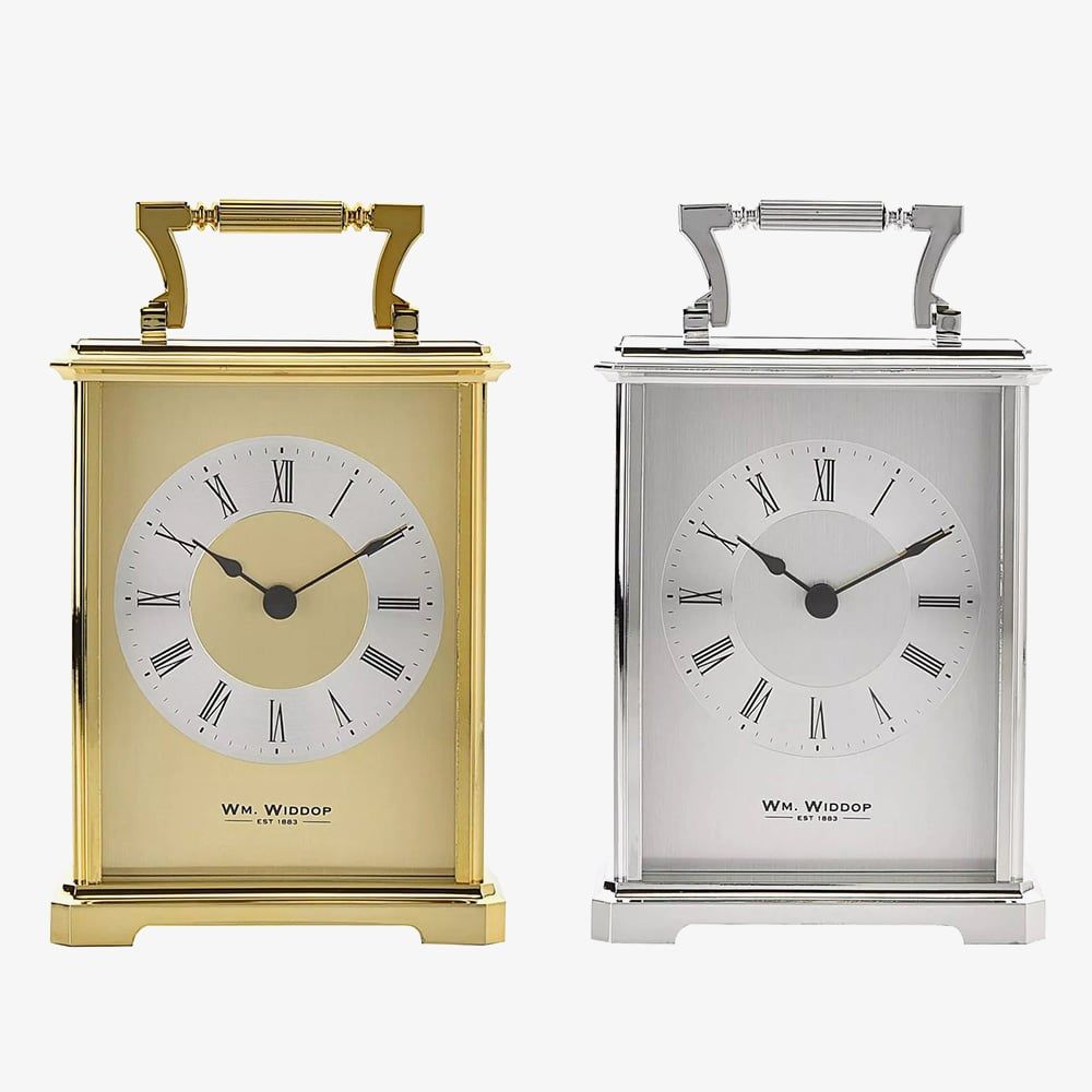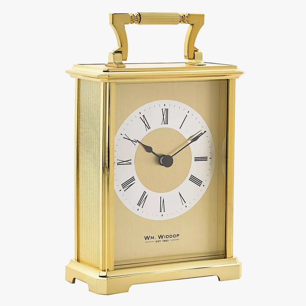 https://www.thbaker.co.uk/gold-gilt-traditional-carriage-clock-w2406178551Gold Gilt Traditional Carriage Clock W2406https://www.thbaker.co.uk/media/catalog/product/2/7/27-03-25156014_01.jpg74.9574.95GBPInStock/Gifts/Clocks/Gifts/Clocks/Carriage Clocks/testing-categories/Test_Andrew/THB-1888-Widdop/Gifts6727800879833687123687672764287149Gp Carriage Clk Gp Dl Rn Decorate your home with traditional styling with this gold gilt carriage clock by WM Widdop. Powered by the Quartz movement the clock face features Roman numeral hour markers and fancy black hands on a contrasting white background. The gold tone metallic effect finish has a combination of smooth and textured side detailing, paired with the ornate handle this clock is an attractive centrepiece for mantels and bedside tables. Battery operated, not included.