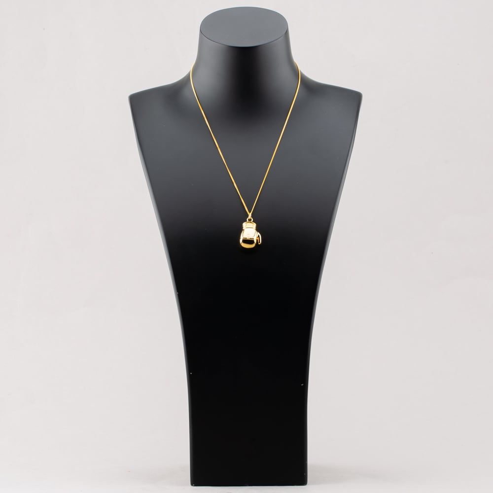 Step into the ring of style with this striking gold-plated sterling silver necklace, featuring a finely detailed boxing glove pendant that packs more than just shine. Crafted with precision, the glove opens to reveal a hidden motif of two boxers mid-fight. Suspended from a classic curb chain and secured with a bolt ring clasp, this piece blends timeless craftsmanship with bold personality.