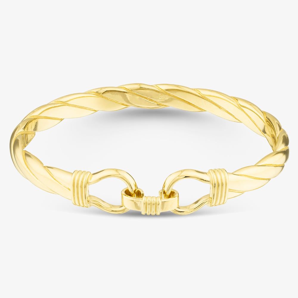 Make a lasting impression with this large hook bangle, crafted from premium 925 sterling silver and finished with a luxurious layer of gold plating. Its sleek, minimalist design features a modern hook closure, combining simplicity with sophistication. The high-polish gold finish adds a radiant glow, making it the perfect piece to complement both casual and formal looks.