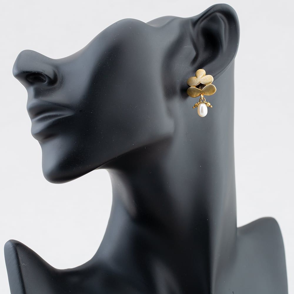 These gold-plated dropper earrings feature a beautiful flower design, delicately complemented by a simulated white pearl. With their elegant and feminine aesthetic, they add a touch of timeless charm to any outfit.