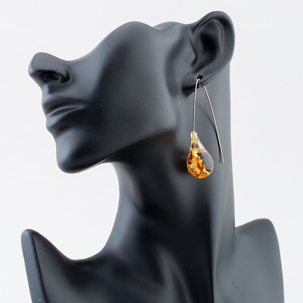 These gold-plated dropper earrings showcase a striking round bubble at the base, elegantly paired with a fine gold leaf design. Their unique combination of elements adds a refined, nature-inspired touch to any look.