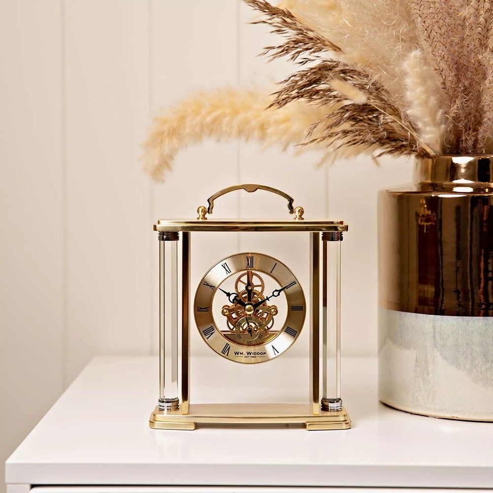 A beautiful centrepiece for any room, this glass and aluminium carriage clock by WM Widdop highlights intricate detail and precision of the Quartz movement. The satin finish gold aluminium frame offers support to the clear glass panel that houses the 'floating' dial complete with Roman numerals, ornate hands and skeleton design revealing the Quartz mechanism. Battery operated, not included.