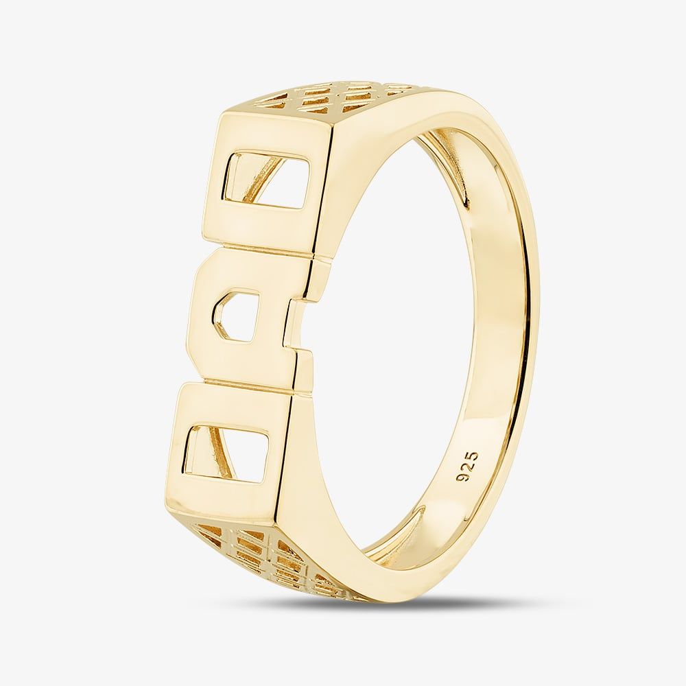 This gold plated sterling silver DAD ring offers a stylish and heartfelt way to honour the special bond with dad. Featuring a polished finish, it blends classic elegance with meaningful sentiment, making it an ideal gift or cherished keepsake.