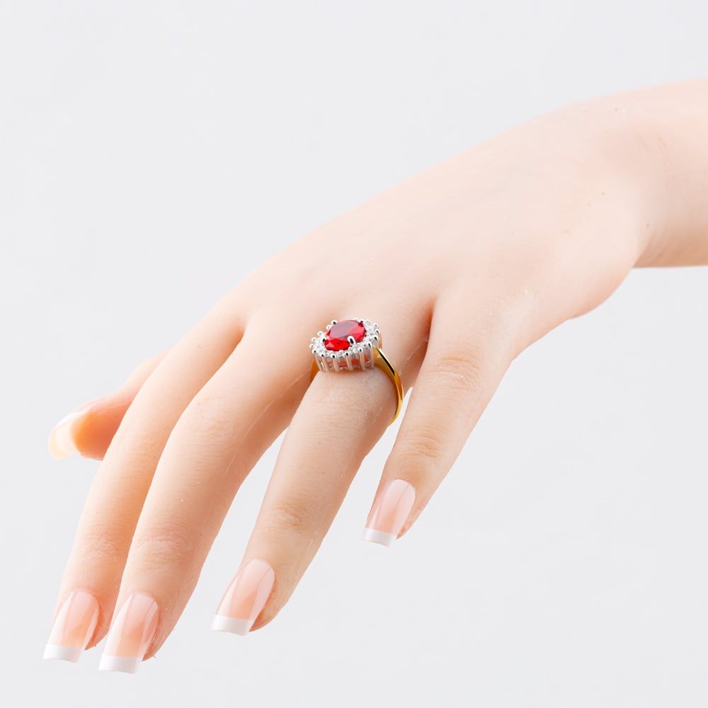 A dazzling gold plated sterling silver halo ring featuring a large oval-cut red cubic zirconia at its centre in a four claw setting, surrounded by a radiant halo of white brilliant-cut cubic zirconia stones. This striking design exudes elegance and timeless glamour.