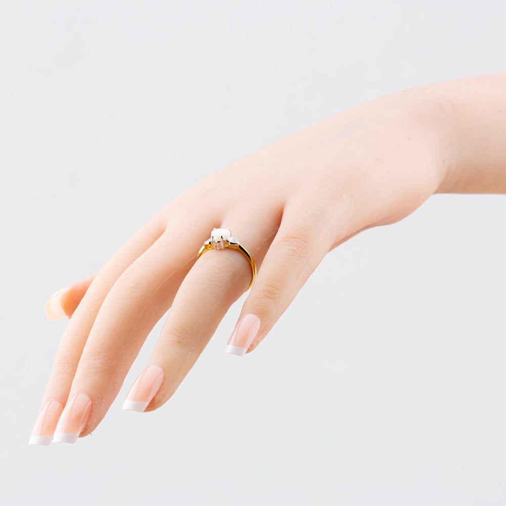 A delicate gold plated sterling silver ring featuring a captivating white opal heart at its centre, flanked by sparkling diamonds on each side for a touch of timeless elegance.