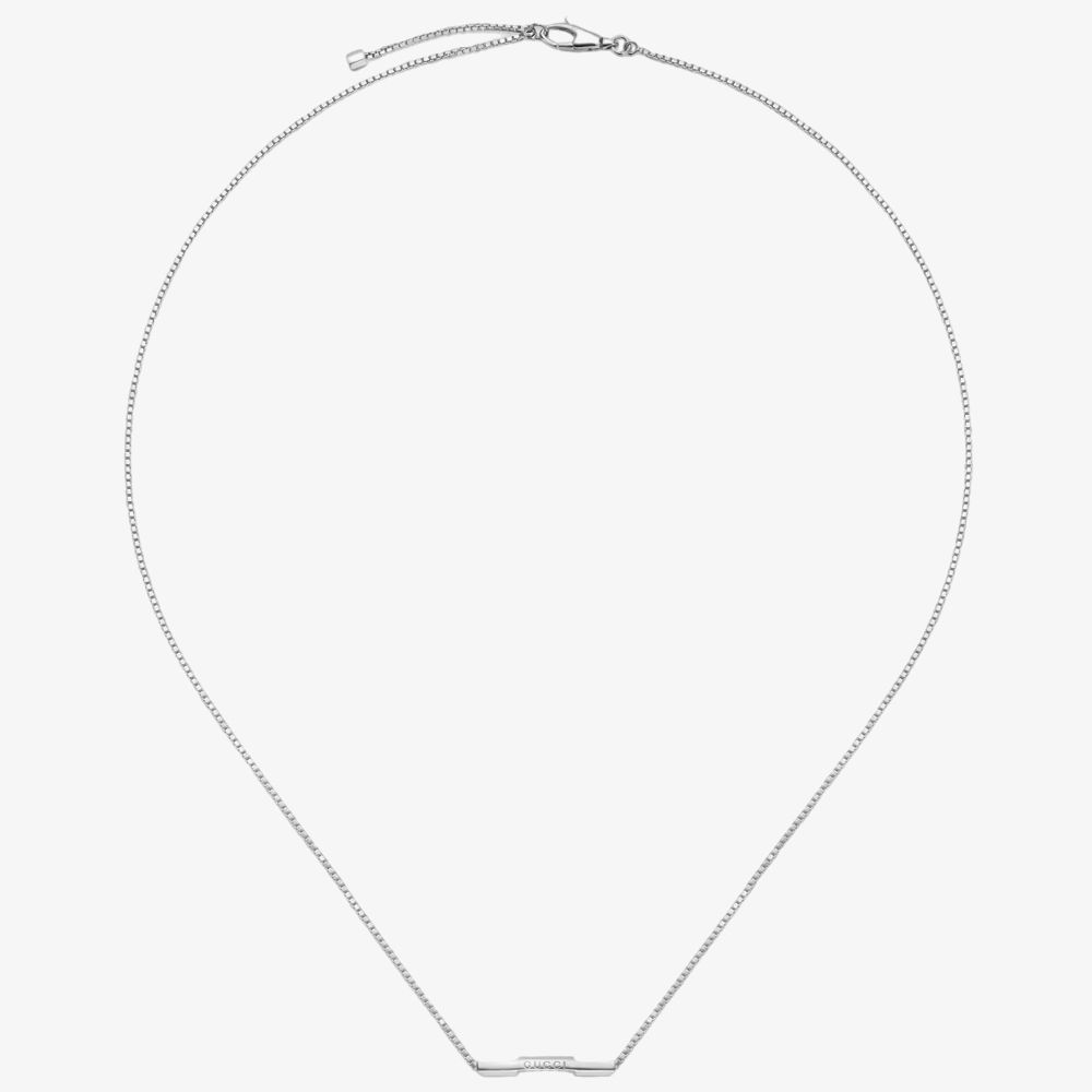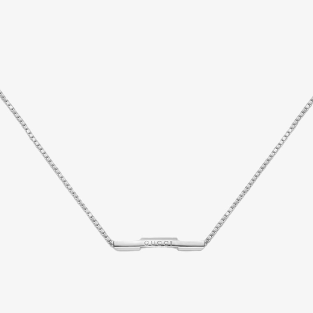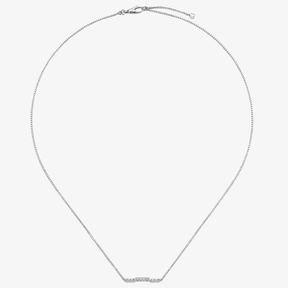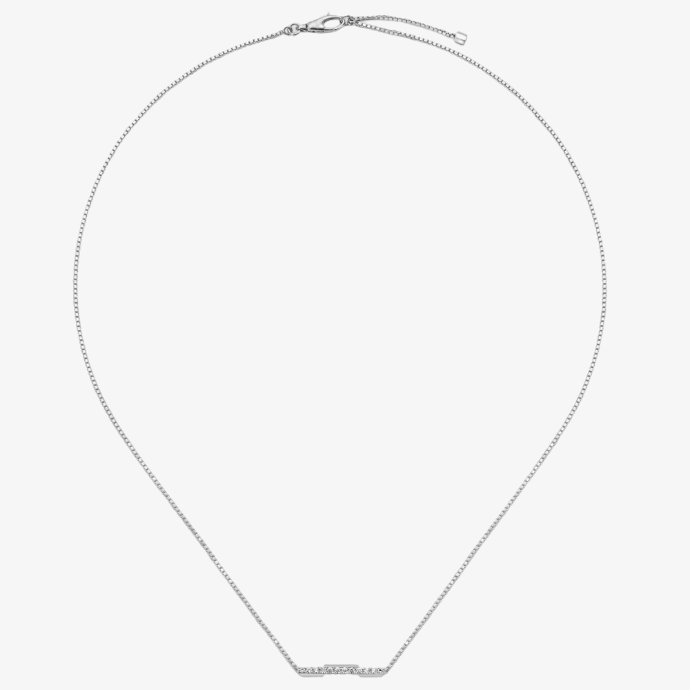 The Link to Love Collection from Gucci explores symbols of love and romance. This elegant 18ct White Gold necklace features a diamond pave bar with 12 diamonds, giving a total weight of 0.14ct. The length is adjustable from 42 cm to 45 cm. This necklace can be worn individually or with additional jewellery to create a stacking look.