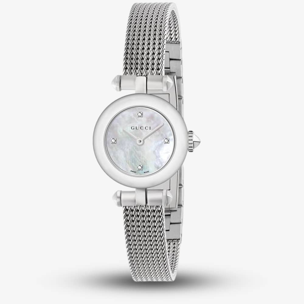 The Diamantissima watch is a vision of refined elegance. Its 27mm case, etched with the iconic Diamante pattern etched into the case, houses a shimmering white mother-of-pearl dial adorned with four delicate diamonds. This tonal motif creates a luxuriously delicate finish.